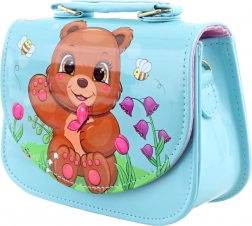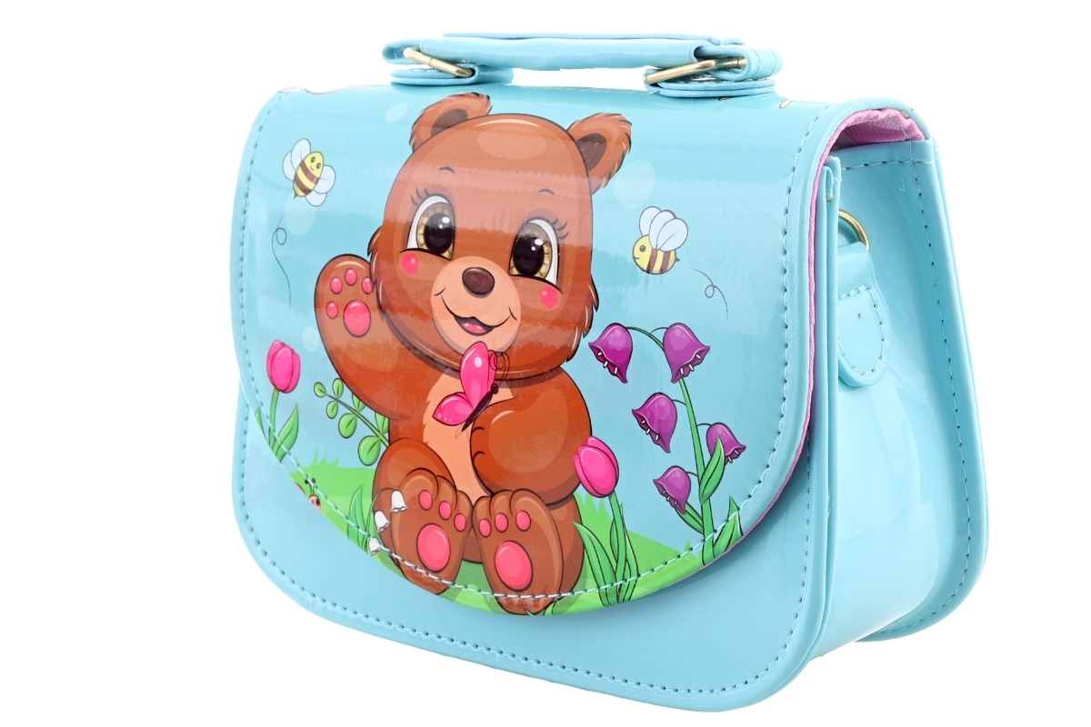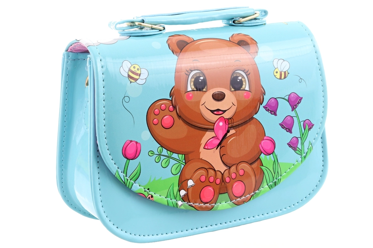 Adorabile borsetta per bambina in colore azzurro chiaro con motivo a orsetto che farà felici le piccole amanti degli accessori. Ha una superficie lucida e facile da pulire, una pratica chiusura a pressione e un unico scomparto principale per i piccoli oggetti. Le dimensioni compatte 18 × 14 × 7 cm sono ideali per fazzoletti, piccoli giochi o accessori. Il prodotto non è un giocattolo.