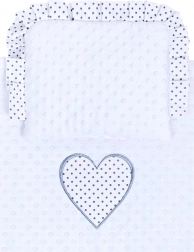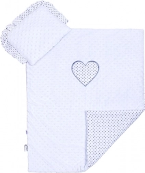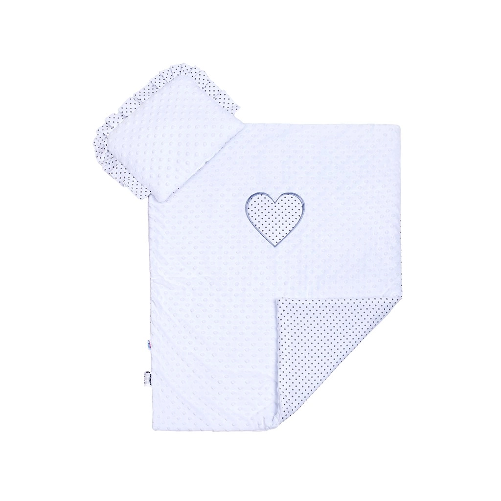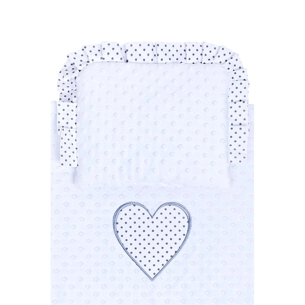 Elegante set bianco di piumini per passeggino in minky e cotone, pensato per la pelle delicata dei bambini. La superficie minky con pallini in rilievo scalda e coccola, mentre il lato in cotone con stampa a pois all-over è piacevole e traspirante. La copertina è impreziosita da un grande cuoricino a pois, il cuscinetto ha un delicato volant – completa alla perfezione ogni passeggino e culletta.