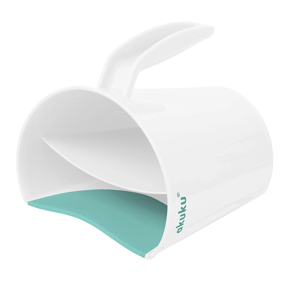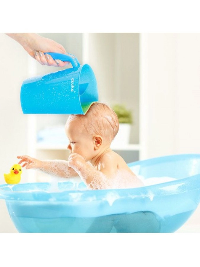 Il contenitore AKUKU in colore bianco‑menta è un assistente intelligente per il bagnetto quotidiano di neonati e bimbi più grandi. Il bordo morbido e adattabile aderisce delicatamente alla fronte e dirige il flusso d’acqua in modo che non entri negli occhi. Le due camere separate consentono un versamento controllato e un risciacquo uniforme di shampoo e schiuma.