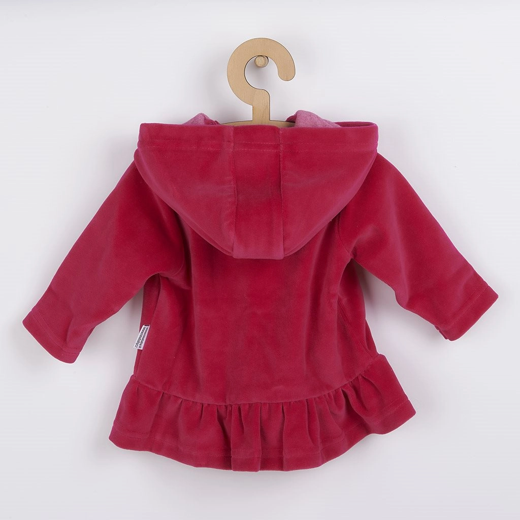 Felpa in velluto con cappuccio, New Baby, colore rosa scuro. Dotata di zip a tutta lunghezza per una facile vestizione e di polsini e fondo elasticizzati per una migliore aderenza e ritenzione del calore. Realizzata in materiale confortevole per l’uso quotidiano.