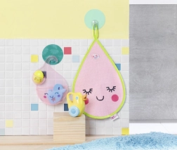 Un asciugamano rosa a forma di goccia con un viso sorridente offre una texture morbida per il divertimento e la sensazione di comfort del tuo bambino durante il gioco.