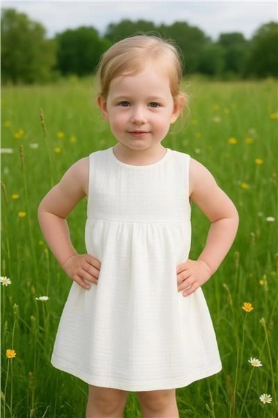 Il pratico taglio smanicato a A con una graziosa gonna arricciata garantisce comodità e libertà di movimento. La chiusura a bottone a pressione sul retro rende il cambio rapidissimo. La mussola è naturalmente traspirante, riduce il rischio di surriscaldamento e, a ogni lavaggio, diventa ancora più morbida e piacevole.