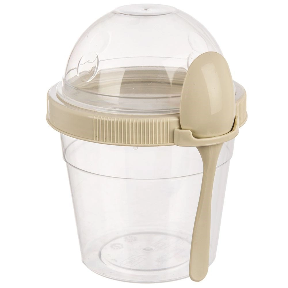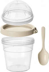 Pratico bicchiere per yogurt con ciotola separata per muesli e cucchiaino integrato, ideale per i viaggi, il lavoro e la scuola. Offre una capacità di 400 ml per lo yogurt e 150 ml per i topping croccanti, un coperchio ermetico anti-perdita e una struttura resistente senza BPA adatta a lavastoviglie, congelatore e microonde (senza coperchio).