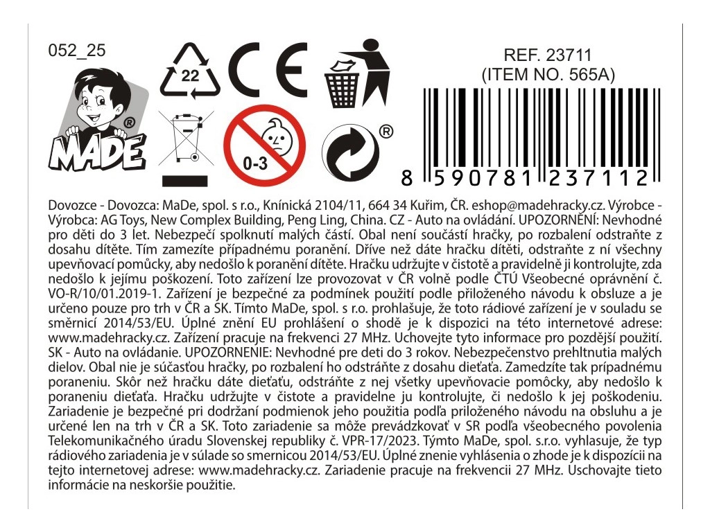 Divertente auto radiocomandata con frequenza 27 MHz per bambini a partire da 3 anni. Dimensioni compatte 19,5 × 12,5 × 10 cm, facile da controllare, plastica resistente e confezione pratica window box. Un regalo perfetto per sviluppare la motricità fine e la coordinazione.