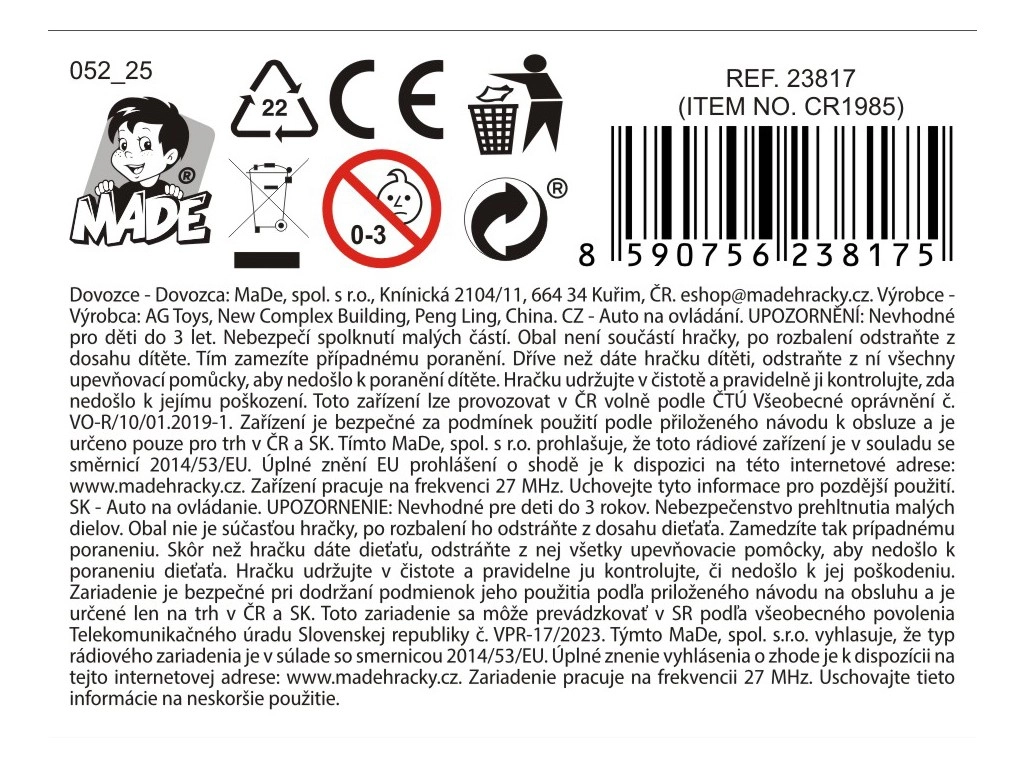 Il modello è realizzato in plastica di qualità, resistente all’uso quotidiano, e viene fornito in una pratica scatola per riporlo o per regalarlo. Basta inserire le batterie e il divertimento può iniziare: ideale per gare in casa e pomeriggi avventurosi con gli amici.