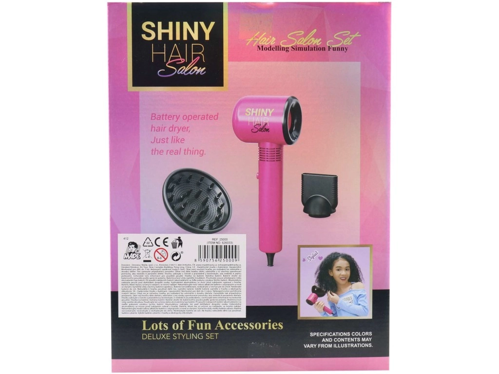 Il set per capelli con asciugacapelli per bambini è un fantastico giocattolo per piccole parrucchiere dai 3 anni in su. Offre un divertimento sicuro, è realizzato in plastica di qualità e grazie alle dimensioni compatte è facile da impugnare. Funziona con 3 batterie AAA (non incluse).