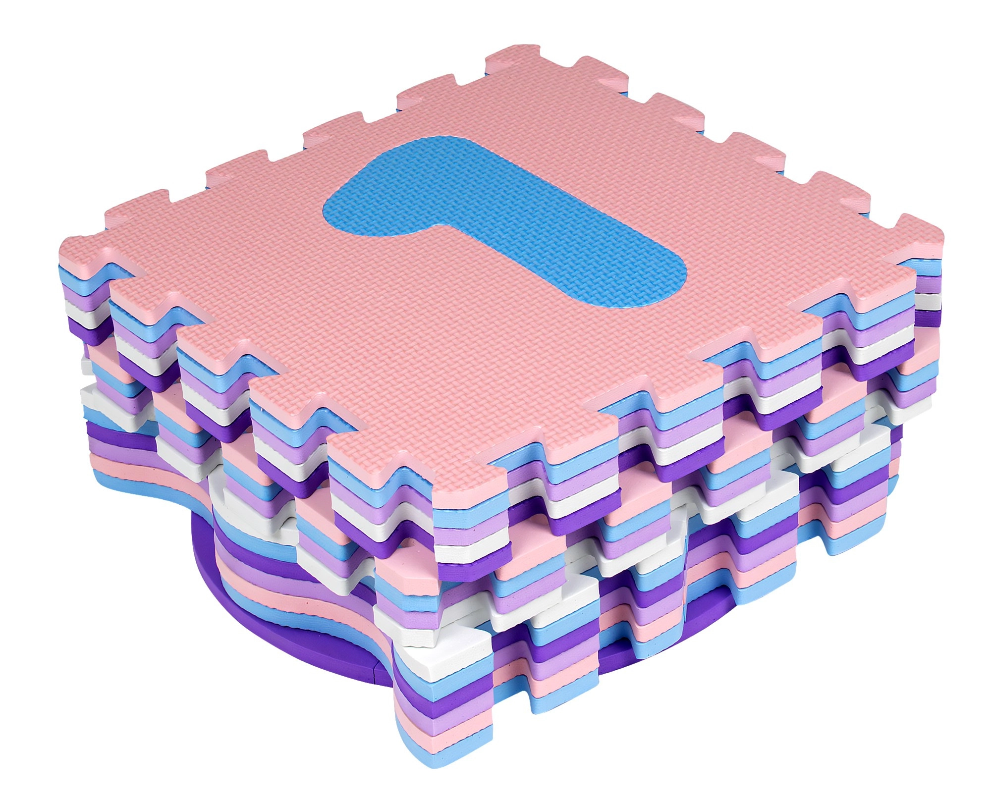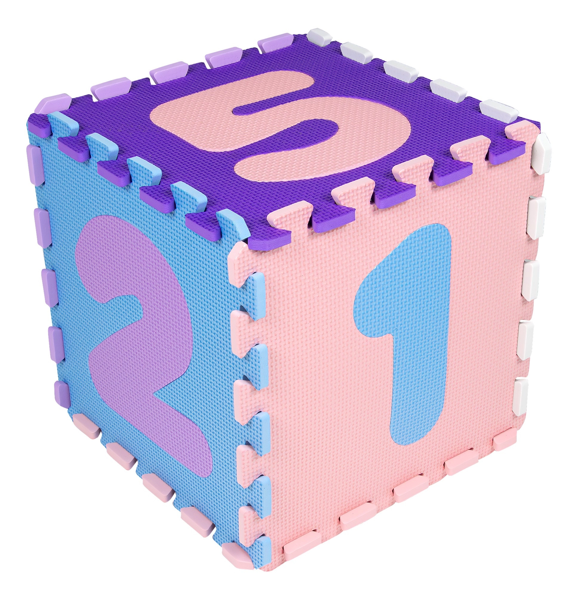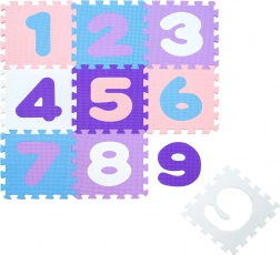 Ogni pezzo ha un elemento estraibile – una cifra da 1 a 9. I bambini allenano così riconoscimento dei numeri, coordinazione e pensiero spaziale. I pezzi possono essere collegati in piano o in forme 3D (ad es. cubo). Il materiale EVA è privo di ftalati, formammide, BPA e PVC, isola ottimamente dal freddo del pavimento e assorbe gli urti.