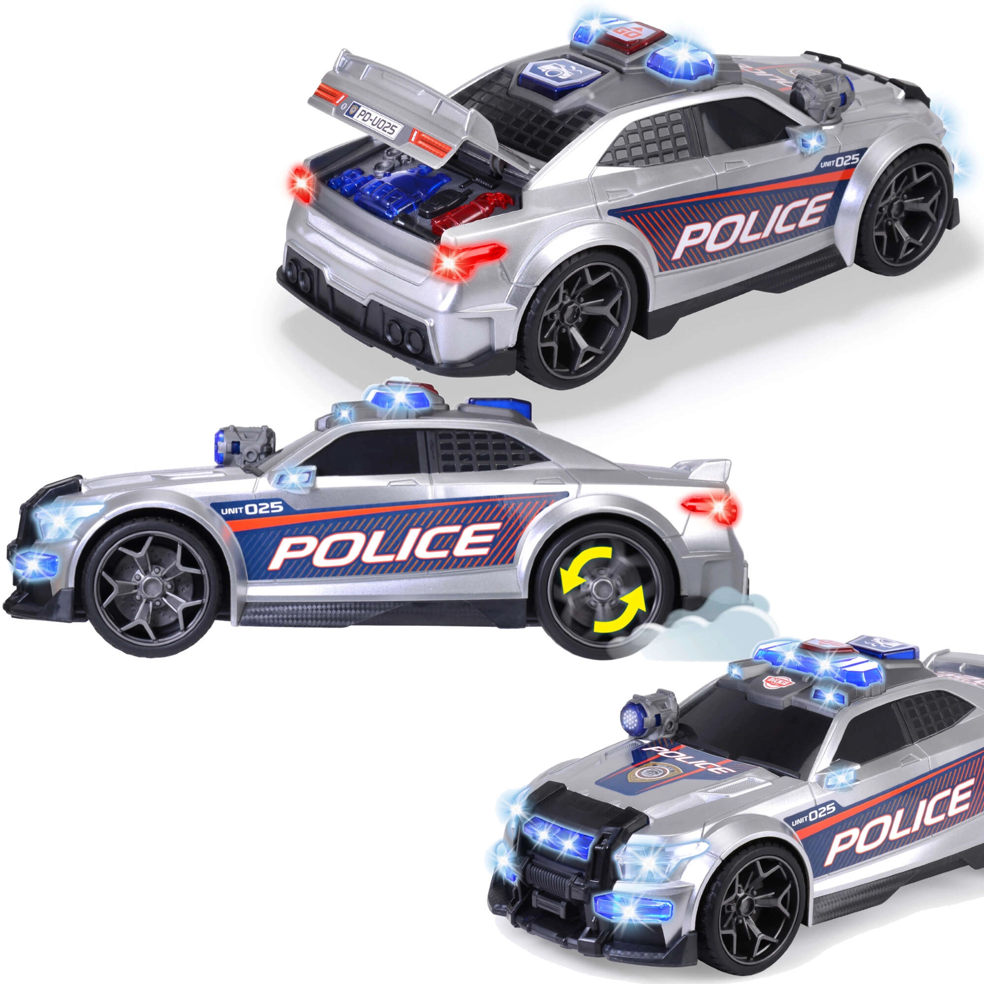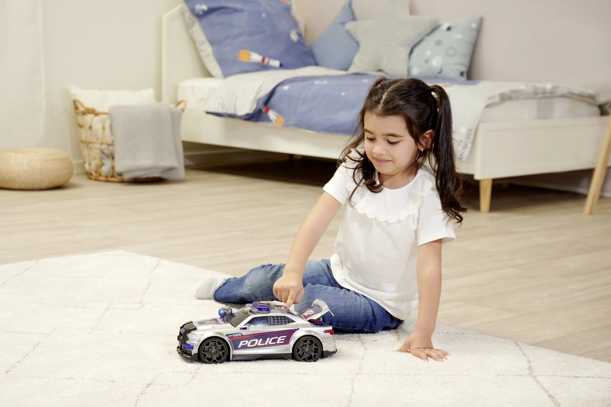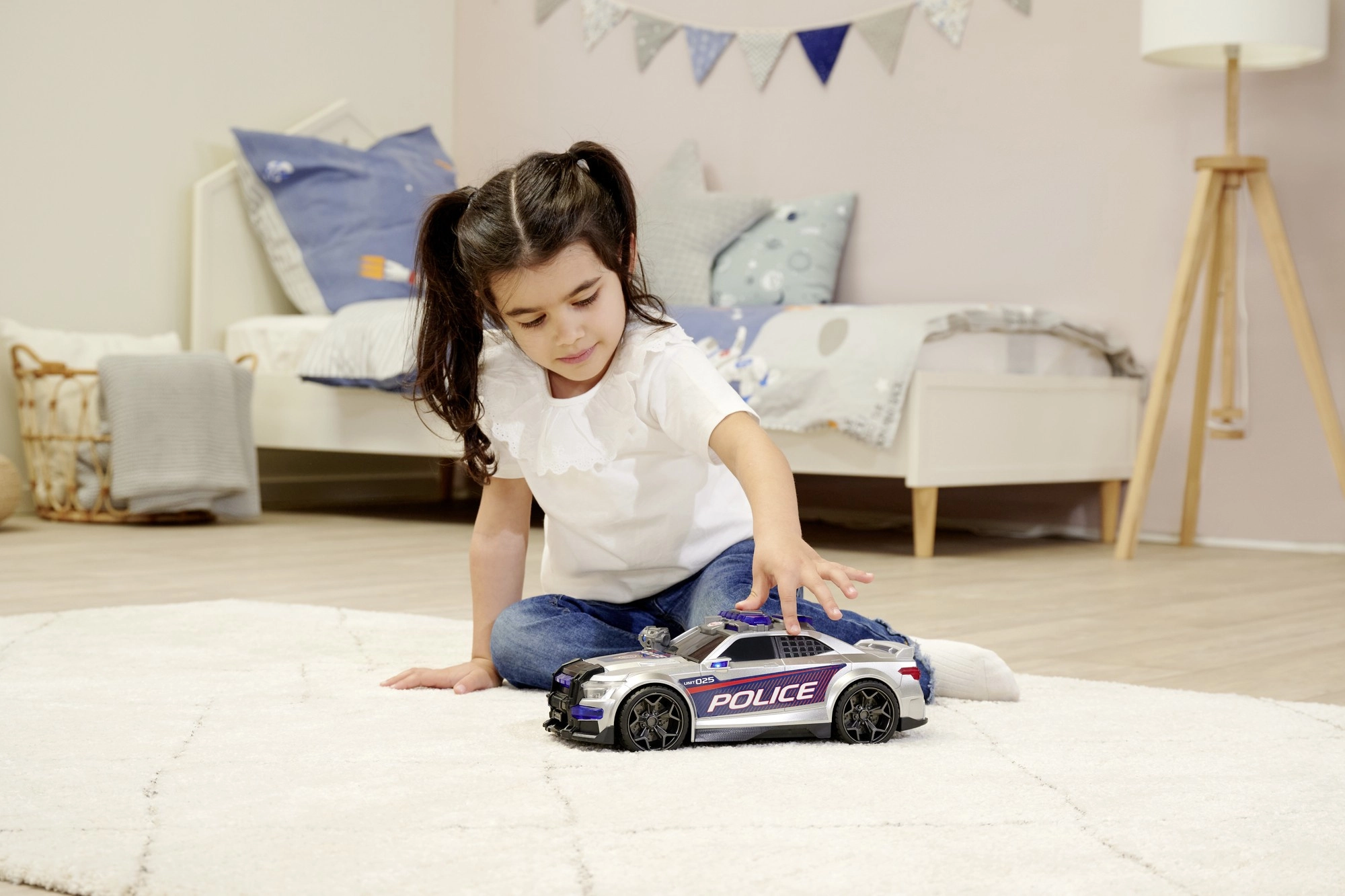 L'elegante auto della polizia Street Force di DICKIE TOYS offre ai bambini un divertimento d'azione realistico. Dispone di effetti luminosi e sonori, una struttura robusta e grandi ruote per una guida fluida sul pavimento. L'attivazione avviene tramite un pulsante sul tetto, che accende le luci blu e rosse e avvia le sirene – ideale per giochi di ruolo da poliziotto.