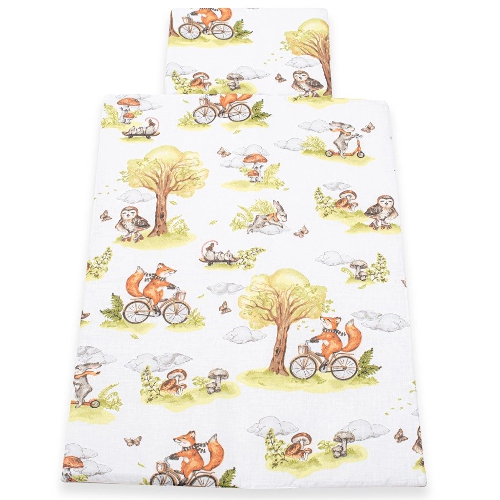 Dolcissimo set biadesivo per passeggino NEW BABY con motivo di animaletti del bosco, che combina morbido cotone 100% stampato e delicato materiale velvet. Il set include un cuscinetto e una copertina con nastrini colorati per la stimolazione sensoriale del bebè. L’imbottitura in fibre anallergiche è sicura e confortevole per l’uso quotidiano. I materiali sono certificati secondo lo OEKO-TEX Standard 100, quindi sono delicati sulla pelle dei bambini, anallergici e resistenti ai colori.