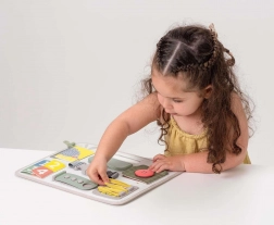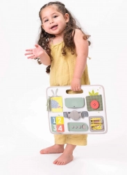 Scopri uno strumento intelligente e sicuro per imparare ogni giorno giocando. TAF TOYS Activity Buckle Board è progettata per bambini dai 18 mesi e combina chiusure pratiche (cerniera, bottone, fibbia, velcro) con elementi sensoriali e attività di conteggio. La maniglia integrata facilita il trasporto, così puoi portarla facilmente in gita, in auto e dai nonni.