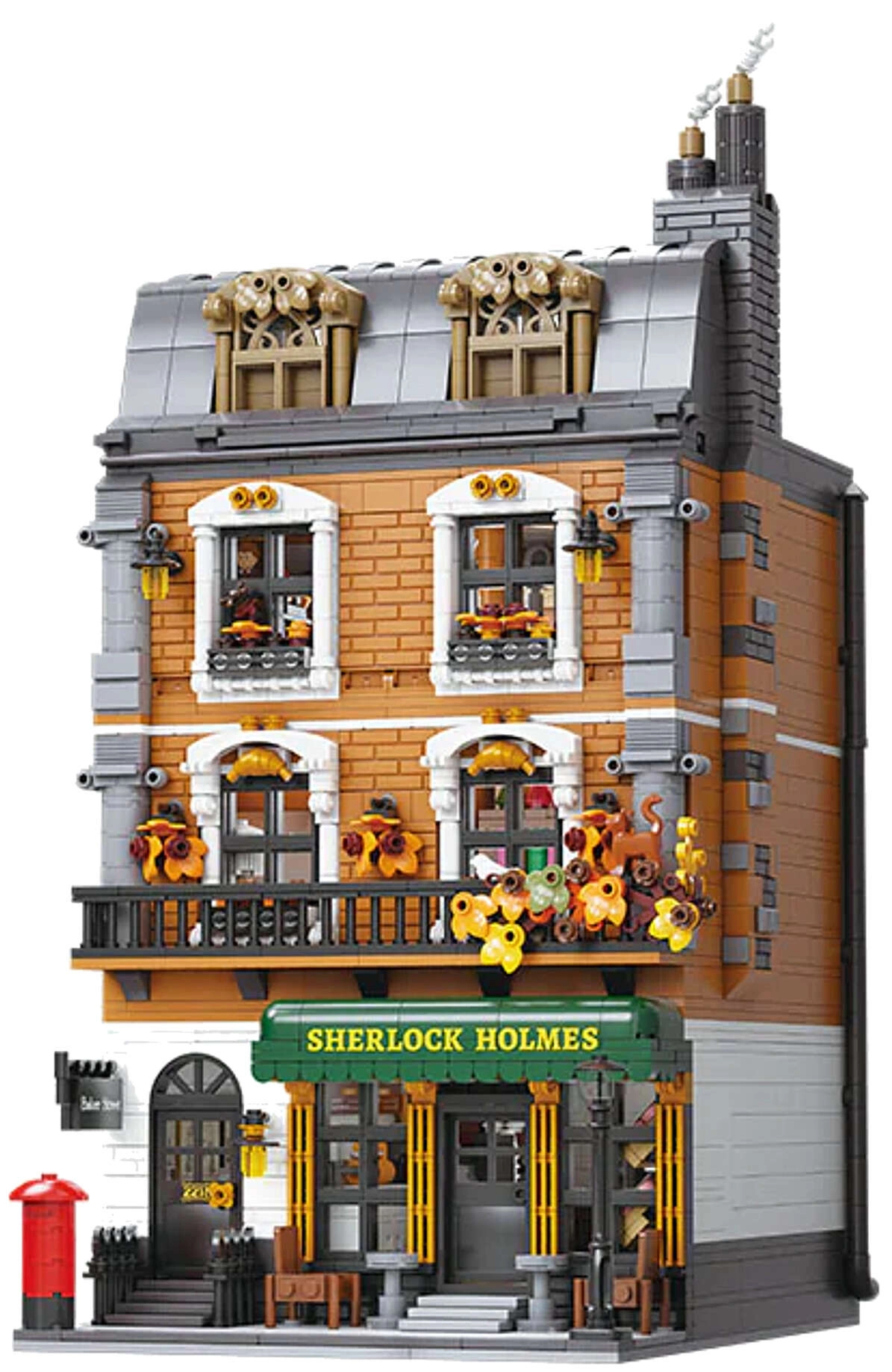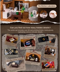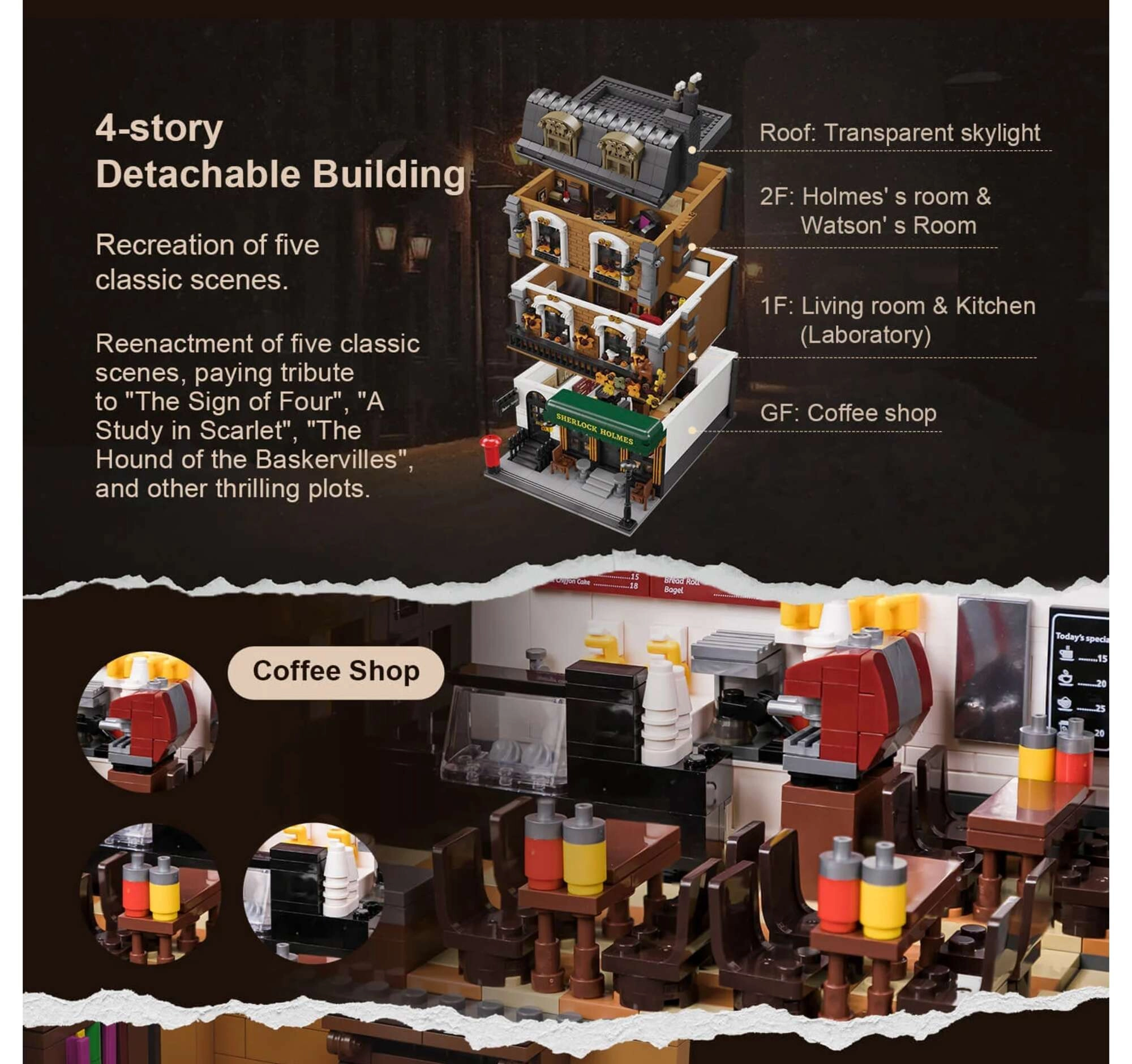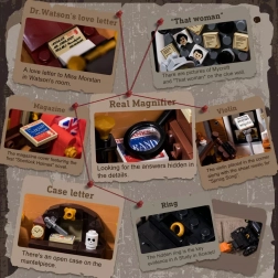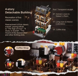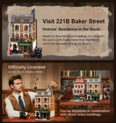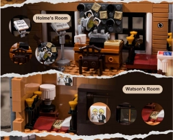Il modello della casa cittadina a quattro piani cattura fedelmente l’atmosfera della Londra vittoriana. Troverai un accogliente salotto con librerie, il bar 221B, la camera da letto di Holmes con giornali e violoncello e lo studio pieno di artefatti. Grazie a oltre 60 mattoncini stampati con motivi di Londra, Watson e mappe, godrai della massima autenticità senza bisogno di adesivi.