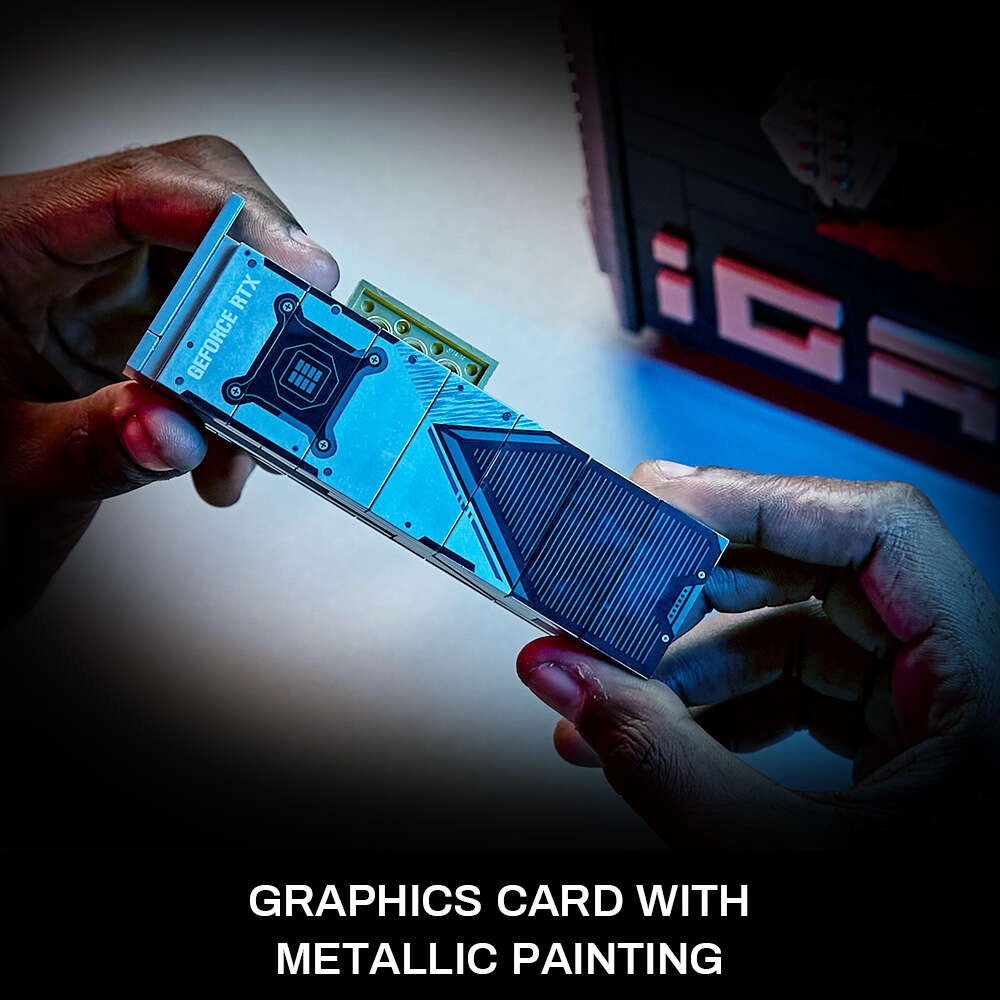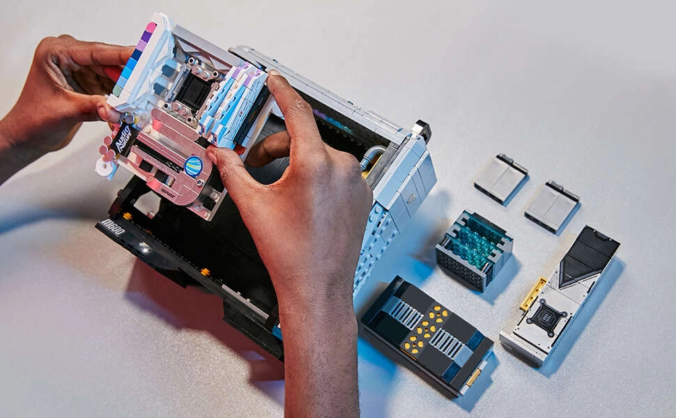 Scopri un set di costruzione originale che riproduce fedelmente un moderno desktop da gaming. Ogni modulo — dalla scheda grafica all’alimentatore e al supporto per SSD fino alla scheda madre e alle memorie DDR — si assembla separatamente, così potrai goderti la sensazione realistica di un “upgrade” del computer. La precisa stampa tampografica sui pezzi assicura un aspetto bello e duraturo senza bisogno di etichette adesive.