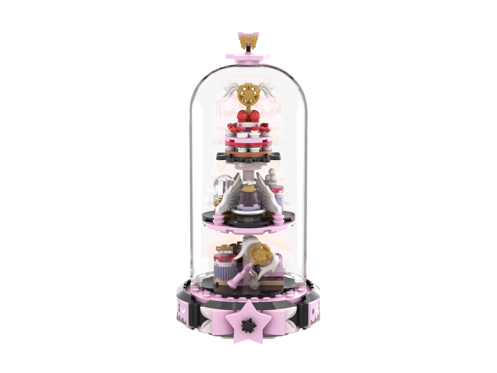 Scopri la magia della costruzione creativa con un modello elegante che conquista con la sua delicata palette rosa e oro e con elementi progettati con cura. La struttura a tre livelli sotto la cupola cristallina sembra un pezzo da esposizione e, una volta assemblata, diventa un’originale decorazione per la cameretta o la scrivania.
