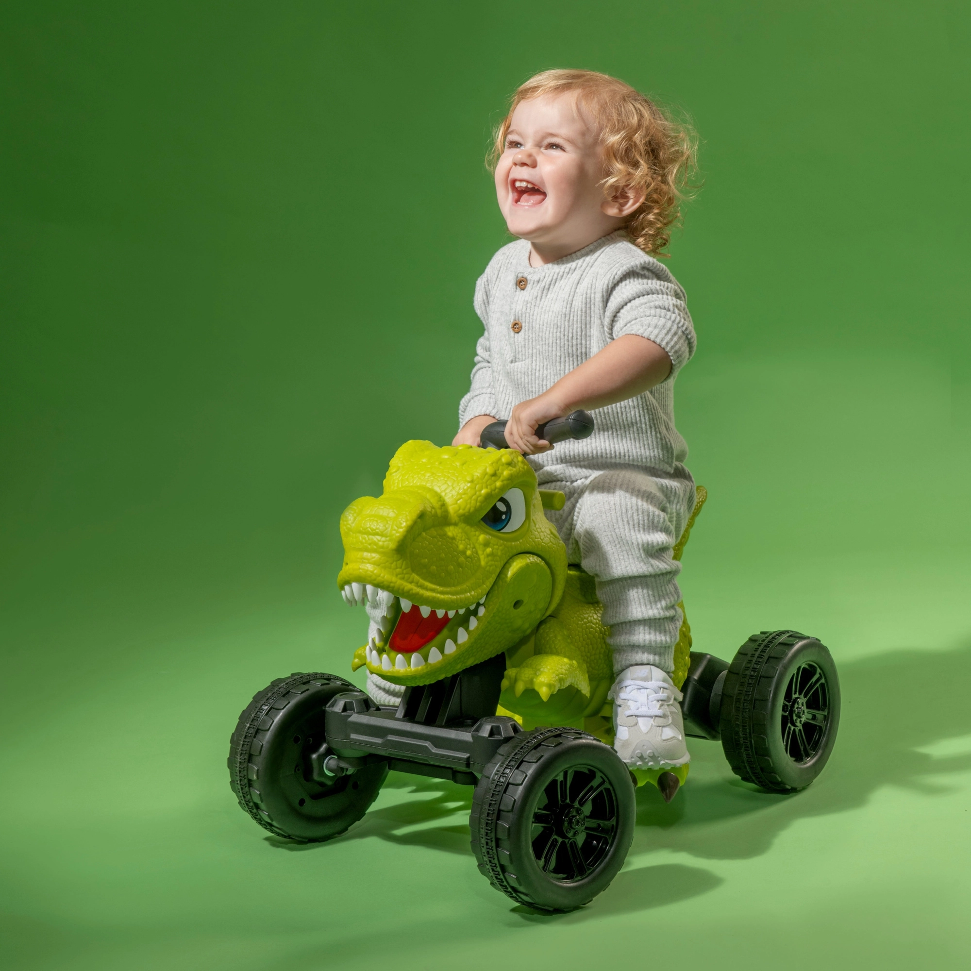 I comandi semplici consentono una marcia fluida in avanti fino a 3 km/h. Le ruote larghe e le pedane antiscivolo aumentano la stabilità, mentre il suono del dinosauro e la bocca che si muove premendo la levetta rendono il gioco interattivo. Inoltre, il colore verde brillante attira l’attenzione dei piccoli piloti.