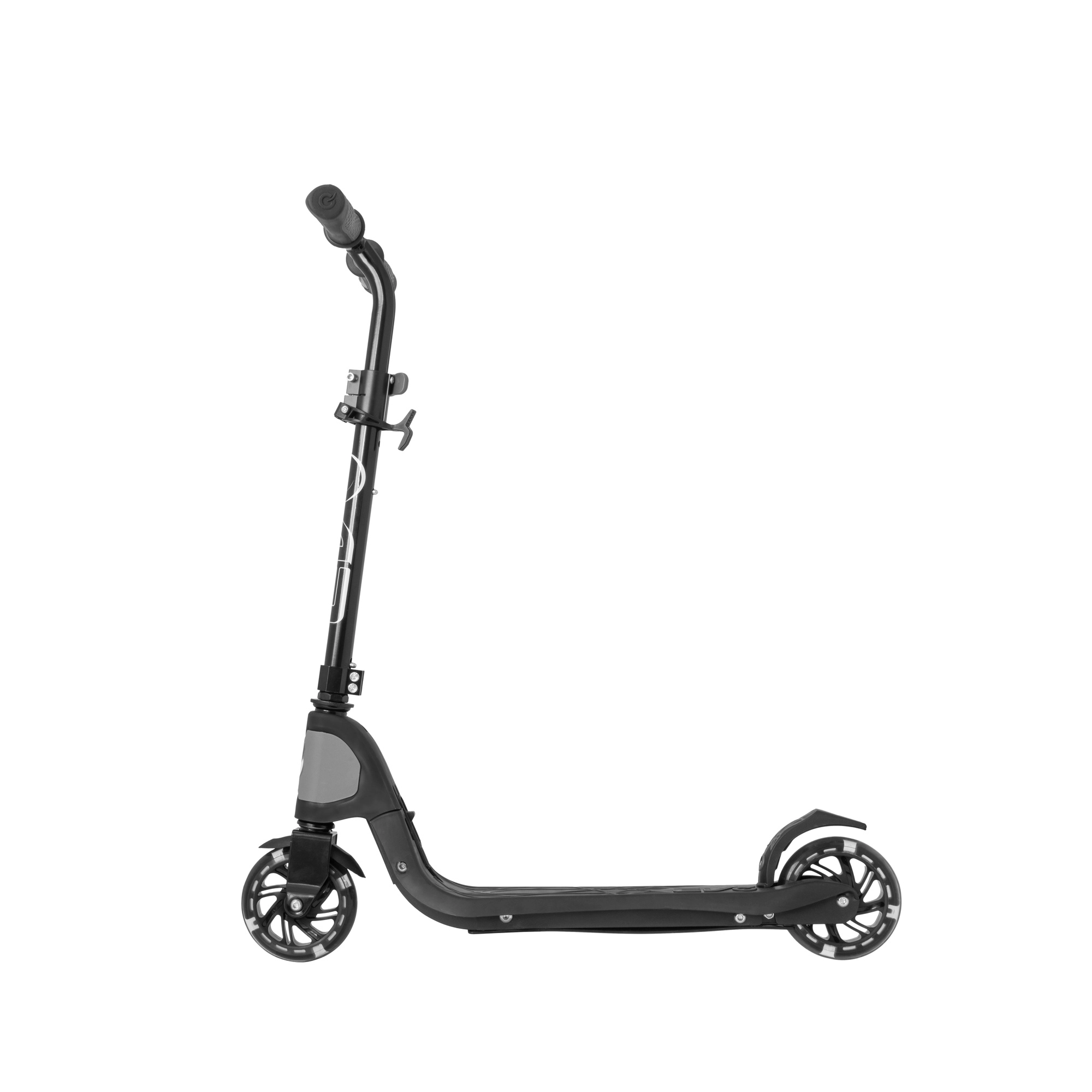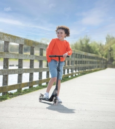 Il pratico manubrio pieghevole e regolabile in altezza (75–80 cm) si adatta facilmente alla statura del bambino. Il freno a pedale integrato nel parafango posteriore offre sicurezza in frenata, mentre le ruote in gomma con cuscinetti ABEC-5 garantiscono una guida silenziosa e fluida su superfici piane.