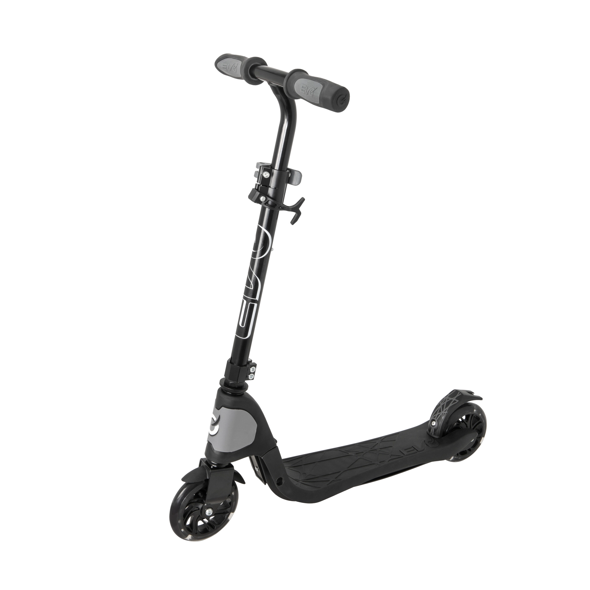 Chiusura rapida per il trasporto o il riponimento. La superficie antiscivolo della pedana con logo EVO aumenta stabilità e sicurezza nella spinta.