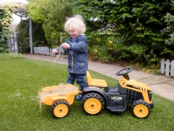 I piccoli agricoltori si divertiranno a caricare il rimorchio e a trasportare giocattoli o piccoli tesori. La struttura stabile a quattro ruote, i poggiapiedi antiscivolo e i materiali resistenti garantiscono una guida confortevole e una lunga durata. I comandi sono intuitivi – avvio con pulsante, marcia in avanti, sterzo con volante.