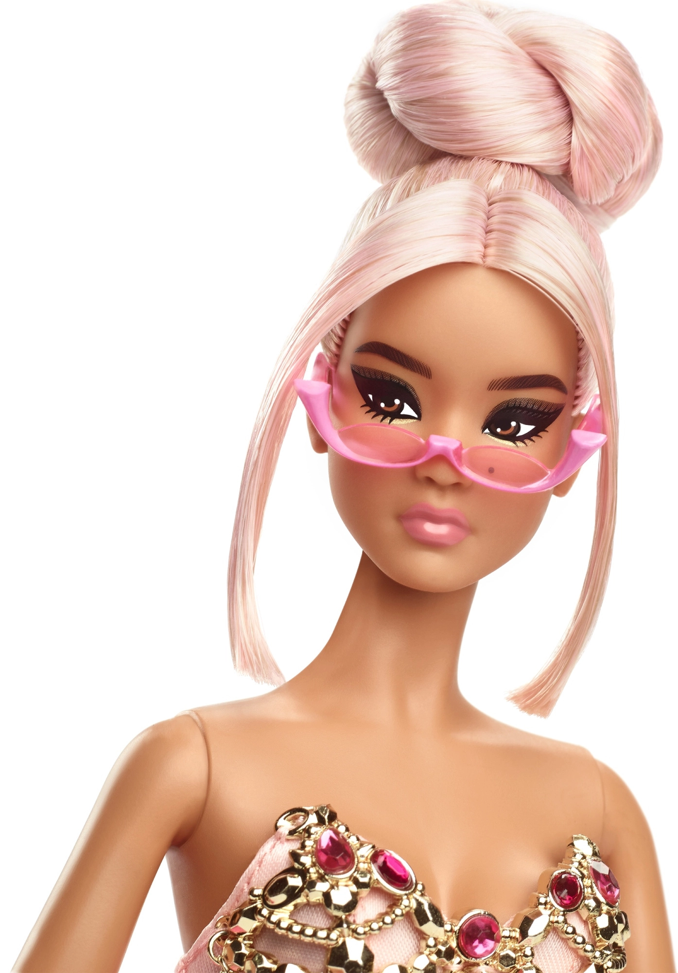 Scopri l'eleganza a prima vista: un abito da sera rosa abbagliante con ricco strascico, corsetto impreziosito da pietre in tono dorato e styling moderno con occhiali rosa donano alla bambola un look iconico. Make-up preciso, accessori curati e la possibilità di posizionamento esaltano ogni dettaglio di stile.