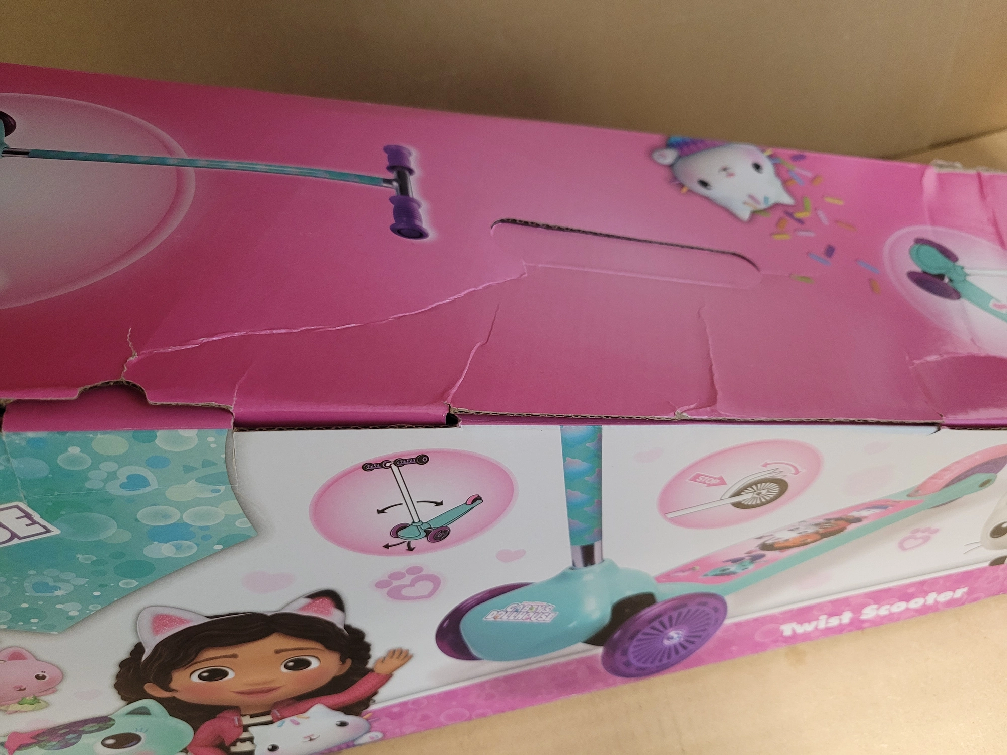 Monopattino per bambini leggero e stabile con motivo GABBY’S DOLLHOUSE per bambini dai 3 anni. Offre tre ruote per sicurezza ed equilibrio, sterzo bilanciato per un controllo semplice, ruote silenziose e freno posteriore a pedale per un arresto sicuro. Ideale per le prime corse e lo sviluppo della motricità. Nota: confezione danneggiata, il prodotto è completamente funzionale.