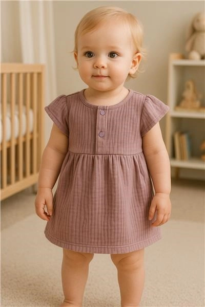 Scopri il fascino della mussola nel vestitino New Baby per bambine in una delicata tonalità lavanda. Grazie alla struttura leggera e traspirante del tessuto, l’abitino è estremamente confortevole anche nelle giornate calde. Il taglio ad A con manica corta e gonna arricciata garantisce libertà di movimento e comfort per tutto il giorno.