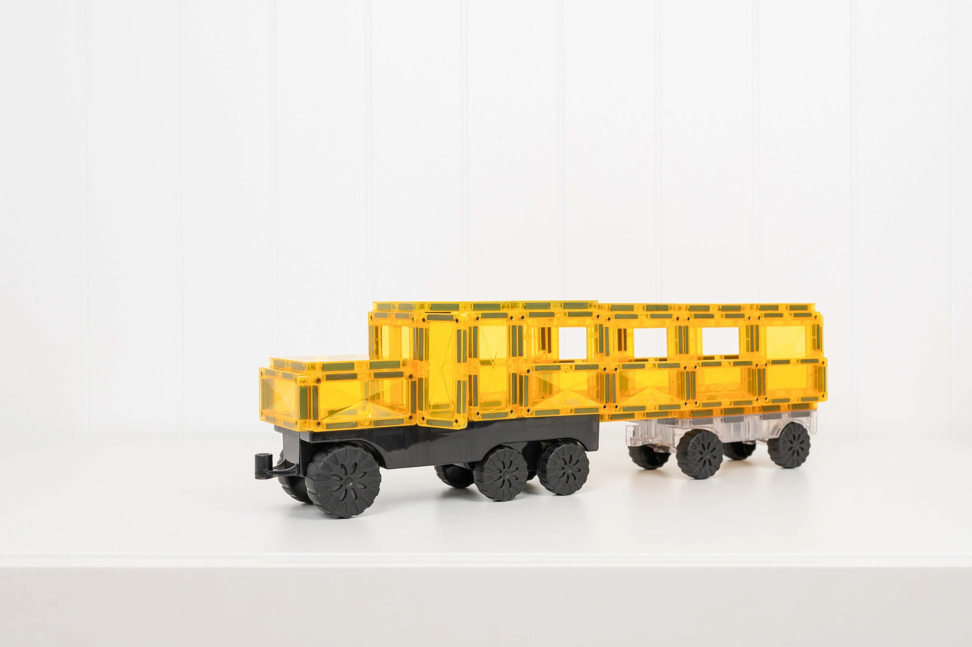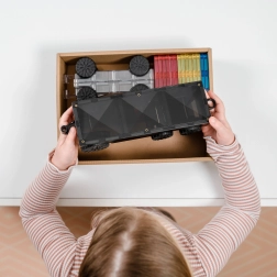 Due telai con ruote e una base per treno trasformano le tessere in modelli su ruote. I bambini possono assemblare un camion, un trenino o un convoglio con vagoni, sviluppando fantasia e coordinazione.