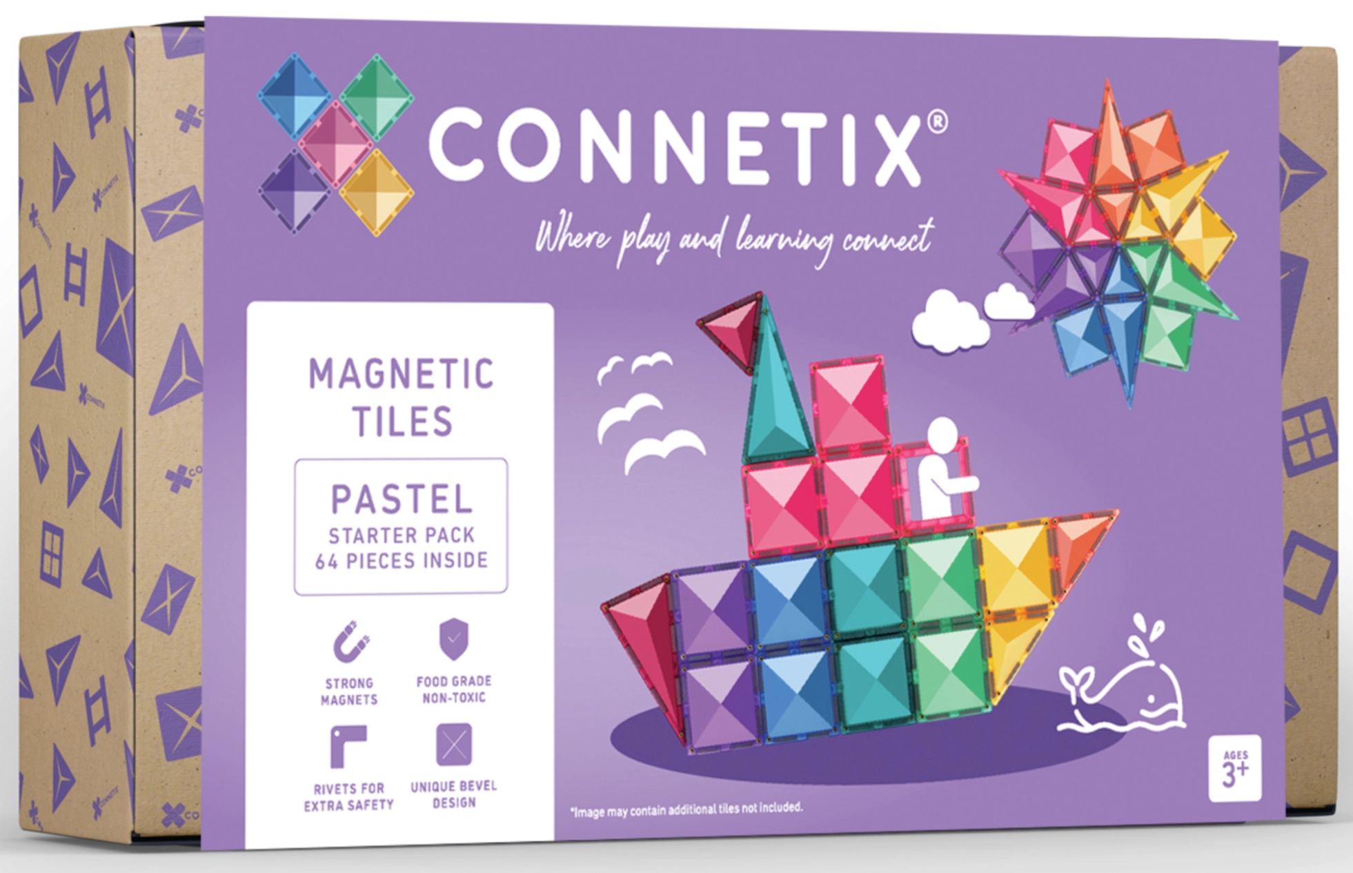 Il Pastel Starter Pack CONNETIX offre 64 piastrelle trasparenti in colori delicati con cui i bambini possono costruire torri, castelli, ponti e razzi. Grazie ai magneti lungo i bordi, i pezzi si uniscono da ogni lato, le strutture sono solide e il piacevole “click” invoglia a continuare a esplorare. Il set è perfetto per sviluppare le competenze STEAM: dal magnetismo e dall’equilibrio alla simmetria e alla geometria 2D/3D.