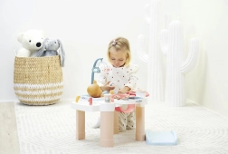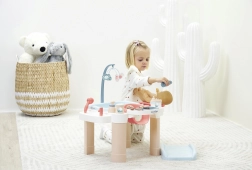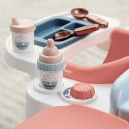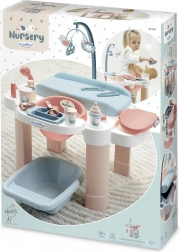 Il tavolino in delicate tonalità pastello è perfetto per la cameretta. La vaschetta con beccuccio, gli organizer per boccette e utensili e il coperchio ribaltabile del piano fasciatoio garantiscono ordine e praticità. 13 pezzi di accessori (boccette, cucchiaino, contenitori, ecc.) rendono il gioco coinvolgente e realistico.