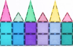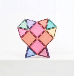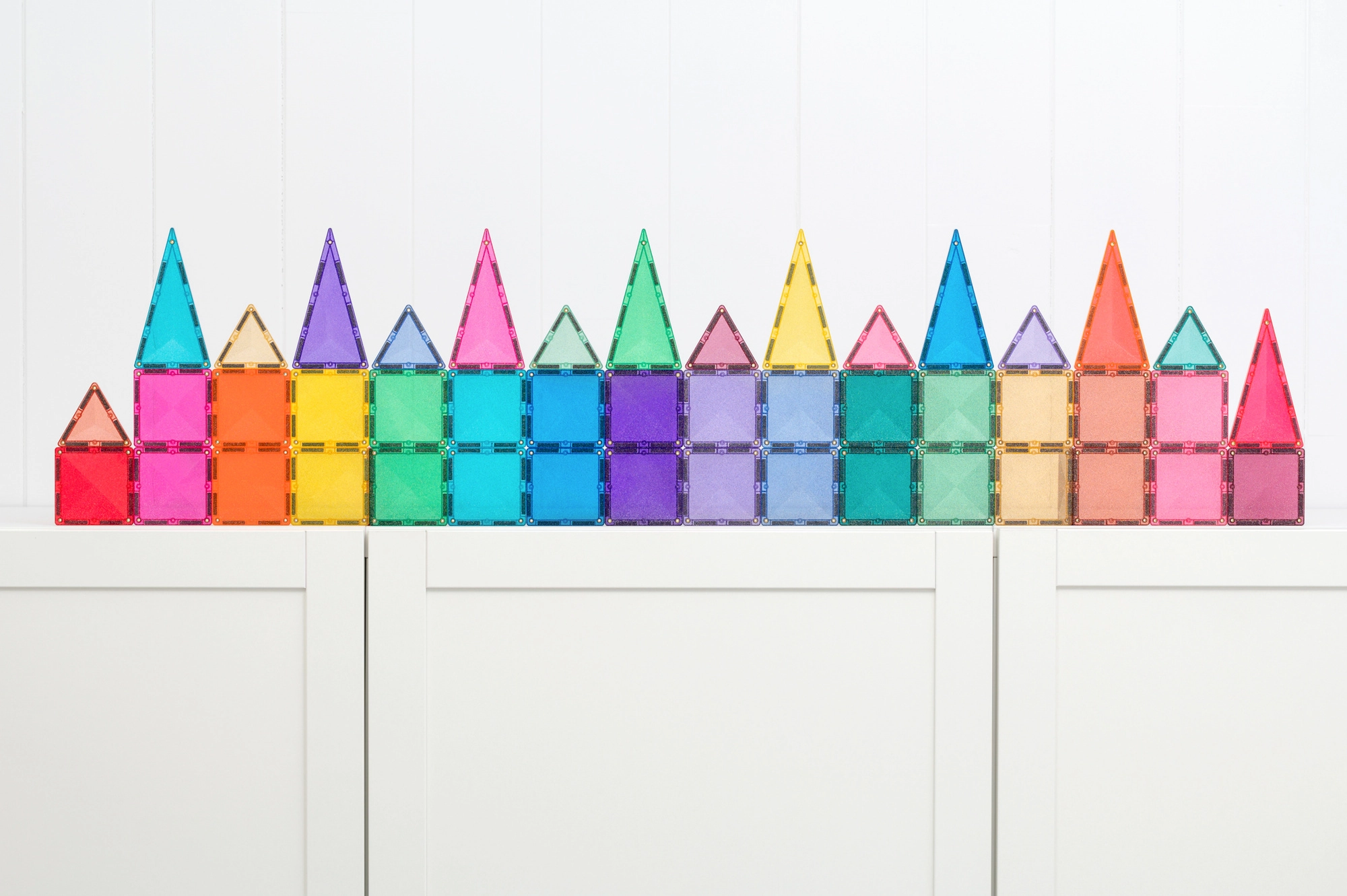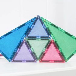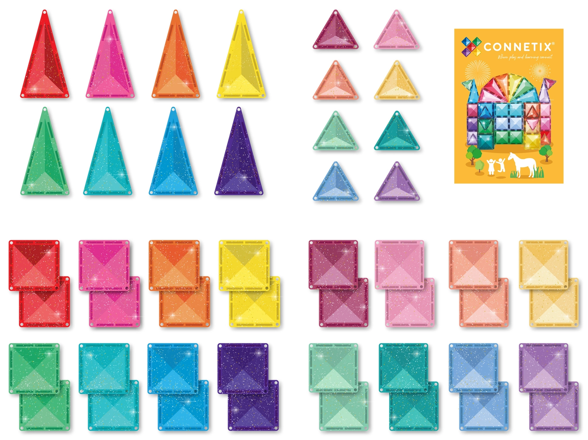 Il set include 48 pezzi magnetici di alta qualità con effetto glitter che, grazie ai magneti lungo il perimetro, si attraggono da tutti i lati garantendo strutture stabili. Le tessere colorate traslucide in resistente ABS privo di BPA e ftalati sono ideali per un gioco sicuro dai 3 anni e offrono una piacevole “click” sensation all’unione.
