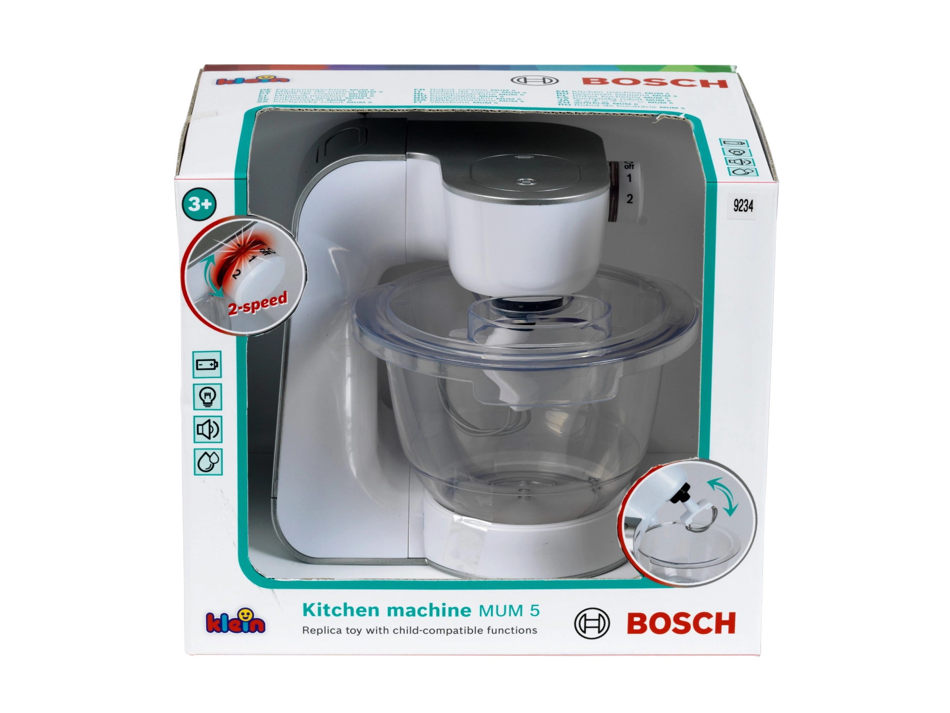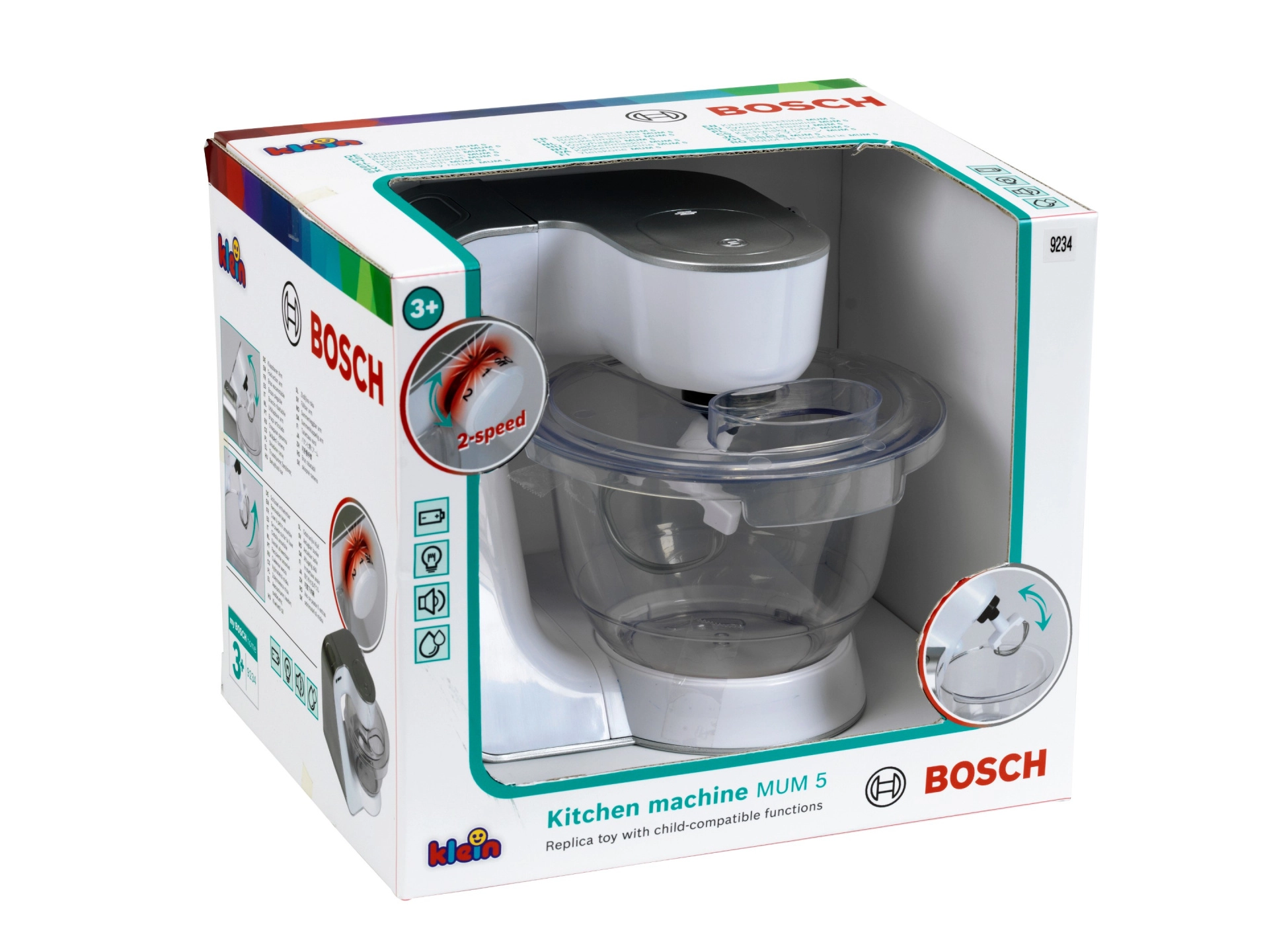 Realistico robot da cucina per bambini con licenza BOSCH del produttore KLEIN, ideale per piccoli chef. Offre effetti luminosi e sonori, 2 velocità, braccio ribaltabile e ciotola trasparente con coperchio removibile. Struttura sicura, materiali resistenti e dimensioni compatte garantiscono tanta gioco creativo in cucina.