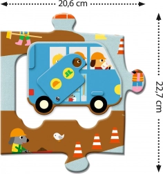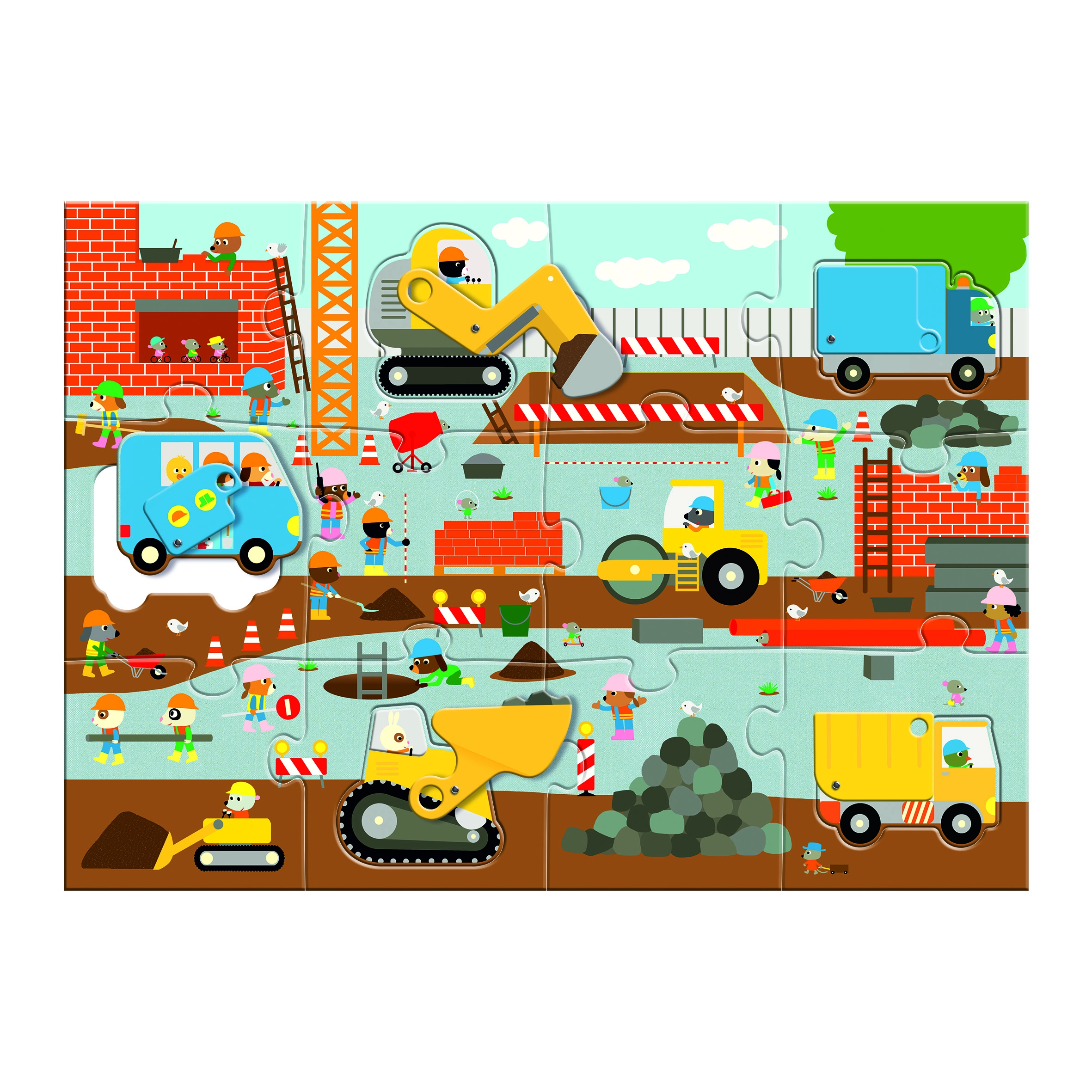 Il puzzle interattivo Cantiere di Djeco unisce costruzione e gioco in uno. Dopo aver completato l'immagine, i bambini possono “dare vita” alla scena del cantiere grazie ai componenti mobili su alcuni pezzi: l'escavatore carica la terra, il camion la trasporta e il lavoro può iniziare. I pezzi grandi e robusti sono facili da afferrare e adatti alle mani dei più piccoli.