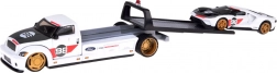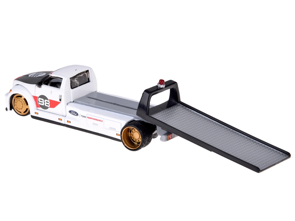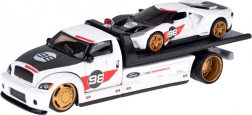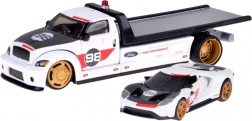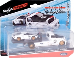 Il set Maisto porta un’autentica esperienza motoristica in formato tascabile. Il carro attrezzi con pianale e rampa di salita funzionale trasporta il modello lavorato con cura FORD GT Heritage 2021 con linee fedeli e numero da gara 98. La combinazione in bianco con dettagli a contrasto e ruote dorate sottolinea l’aspetto premium.