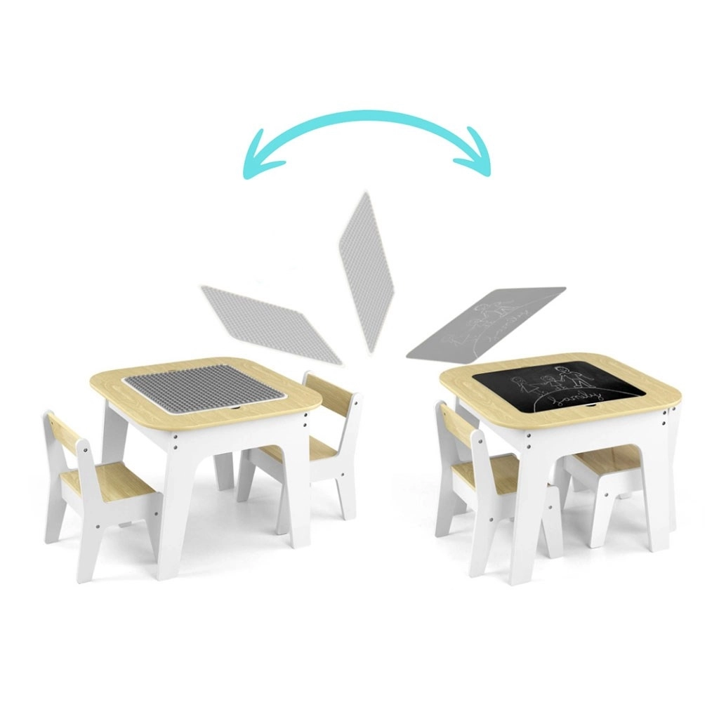 Pratico set per bambini MILLY MALLY Olaf Blocks – tavolo e due sedie – offre una superficie doppia faccia per mattoncini da costruzione e per il disegno, un ampio spazio contenitore sotto il piano e una struttura sicura e arrotondata in resistente MDF. Ideale per bambini dai 3 ai 6 anni, per la cameretta o l’angolo giochi.