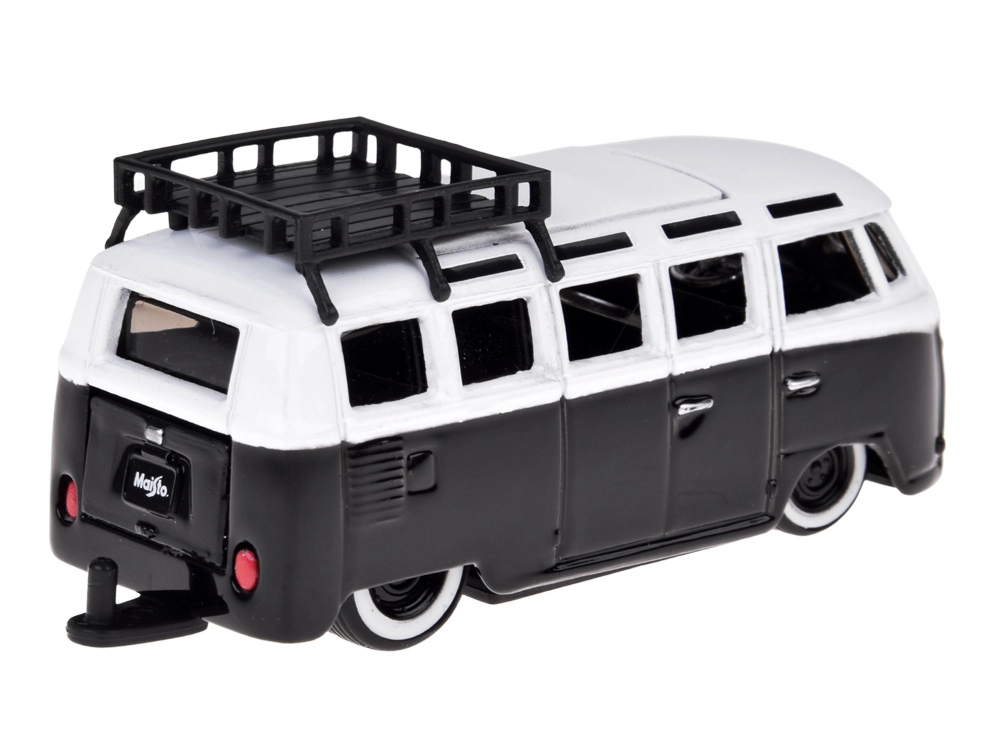 Carrozzeria in metallo, finestrini realistici, ruote e portapacchi sul tetto. Proporzioni precise e sobria colorazione bianco‑nera enfatizzano il carattere retrò.