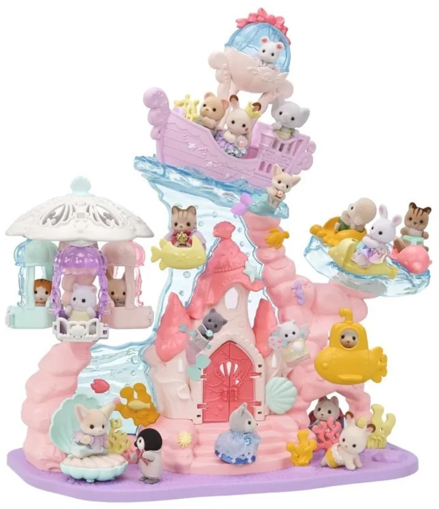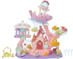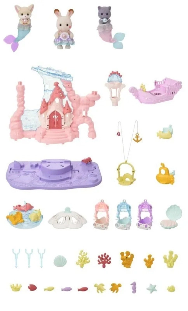 Entra in un mondo incantato con il palazzo sottomarino ricco di funzioni interattive. I bambini possono far viaggiare i personaggi con la funivia, far girare la giostra con meduse e creature marine, navigare nel sottomarino o cavalcare il simpatico pesciolino giallo. Dettagli ricchi, elementi traslucidi e colori pastello creano una scena incantevole per storie senza fine.