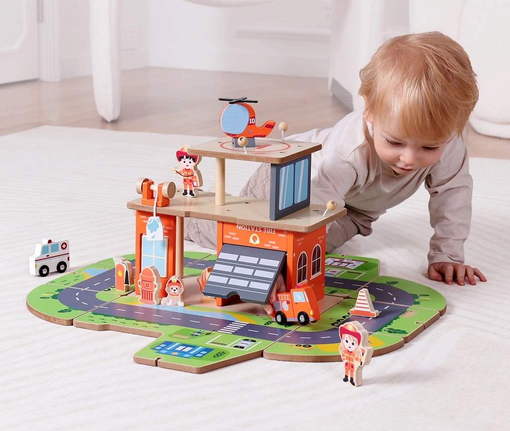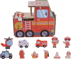 Il giocattolo è realizzato in legno di qualità e con elementi in metallo per una maggiore resistenza. Contiene 13 pezzi colorati tra cui personaggi dei pompieri, veicoli, accessori e attrezzatura di soccorso. È perfetto per bambini dai 3 anni, favorisce la motricità fine, la coordinazione occhio–mano e insegna la collaborazione di squadra.