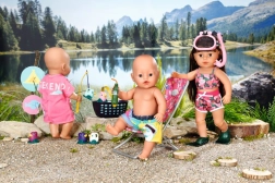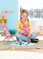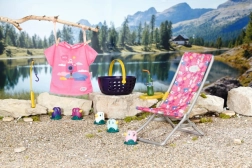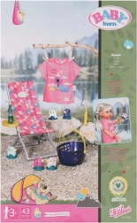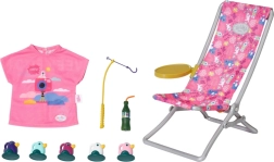 Il set del weekend per la pesca BABY born include abbigliamento, sdraio con tavolino, bottiglia di limonata, cestino, 5 paperelle e una canna da pesca.