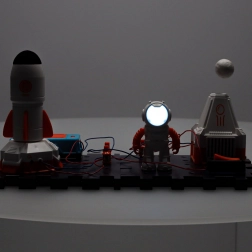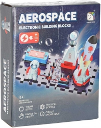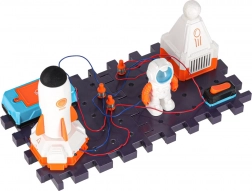 Questo set elettronico interattivo con astronauta, razzo e stazione su base perforata permette ai bambini di comprendere facilmente le basi dei circuiti elettrici. Basta inserire gli elementi nella piastra, collegarli con i cavi rossi e blu e osservare come si accendono i LED, si avvia la ventola o si attiva il generatore d’aria con la pallina fluttuante.