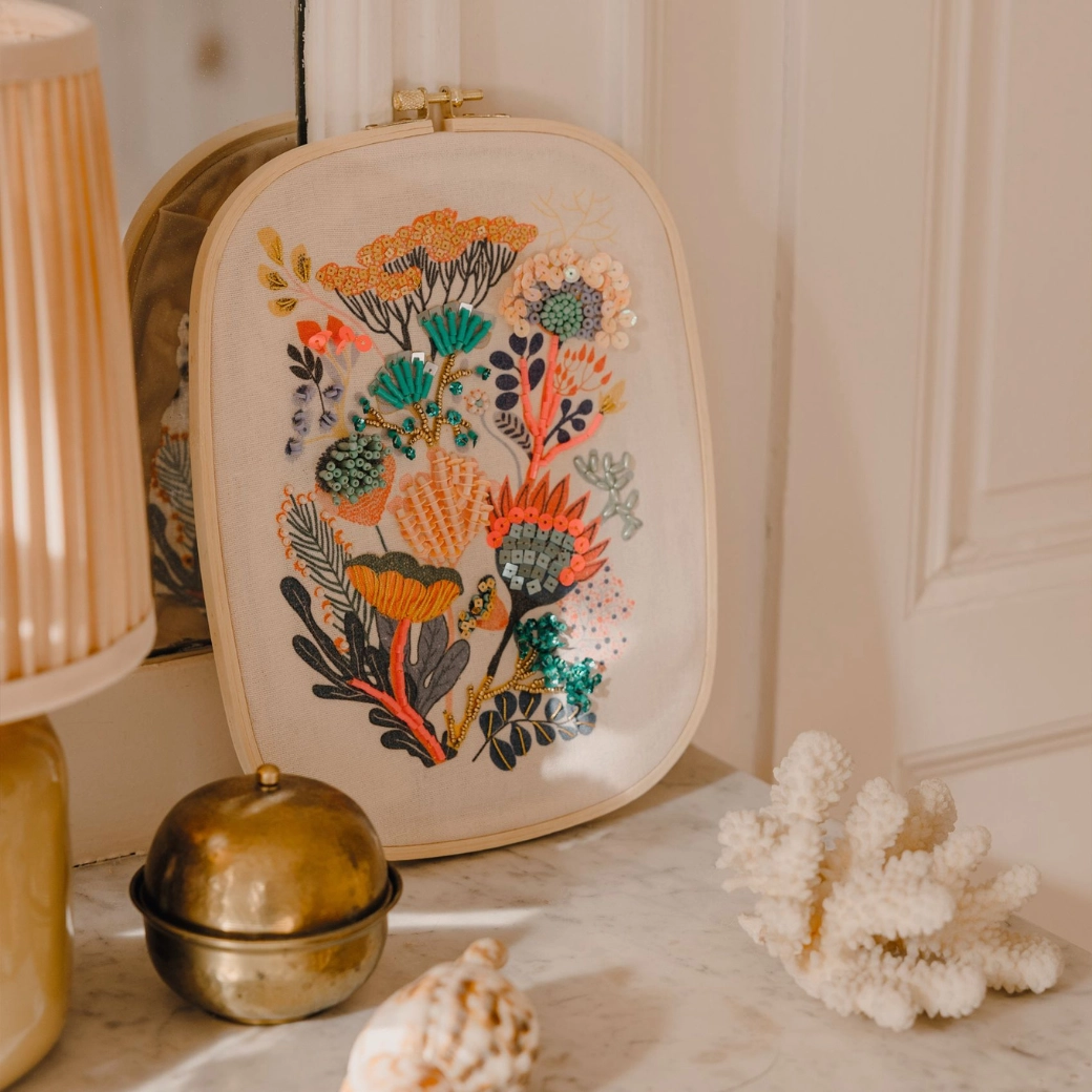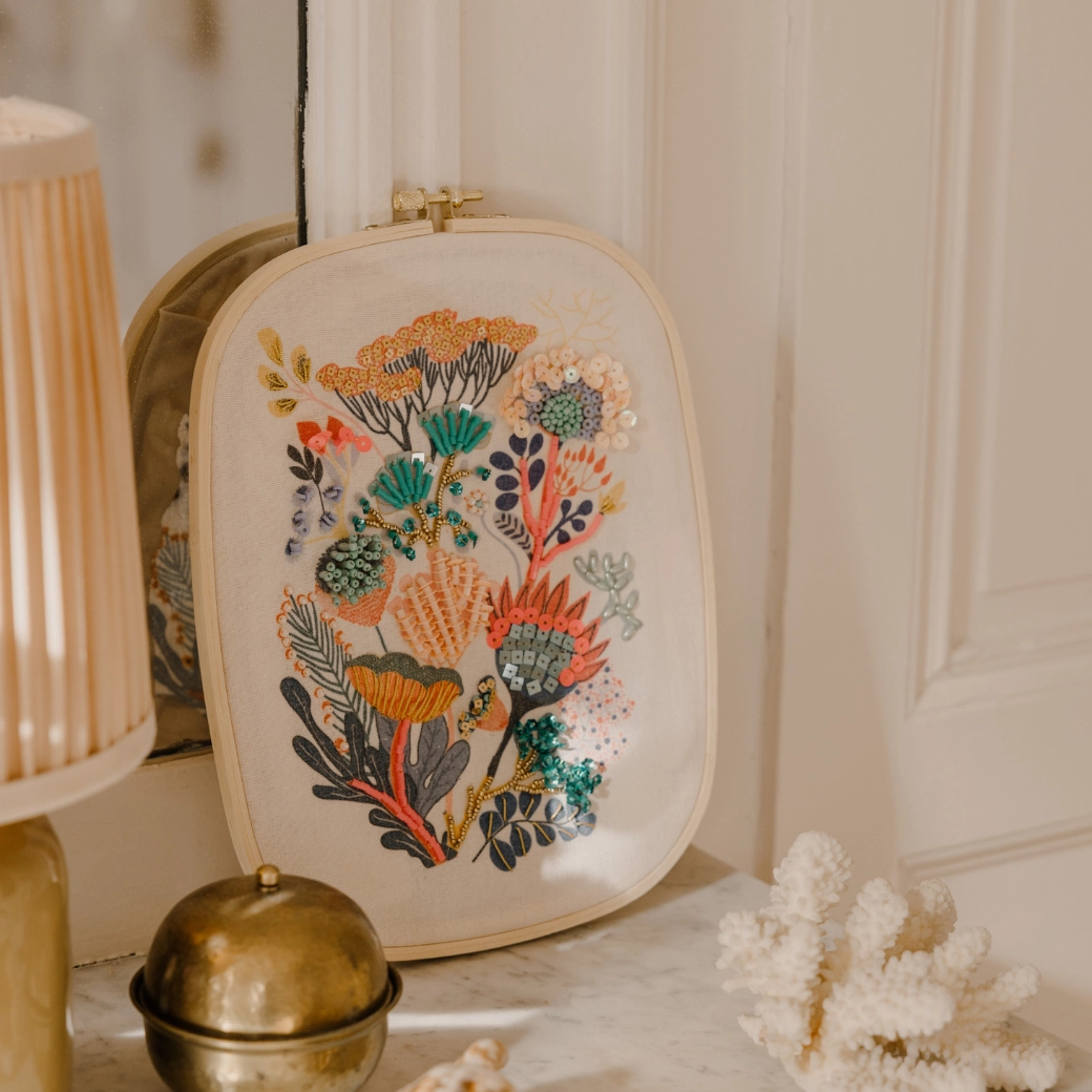 Questo set creativo per ricamo con perline contiene tutto il necessario per realizzare un magnifico motivo floreale: cornice da ricamo in legno, tessuto stampato, fili di cotone, aghi, una selezione di perline e paillettes lucenti e accessori pratici per una rifinitura pulita. È ideale per principianti e avanzati – il procedimento è intuitivo e vi ricompenserà con un risultato sofisticato e scintillante, perfetto da appendere alla parete.