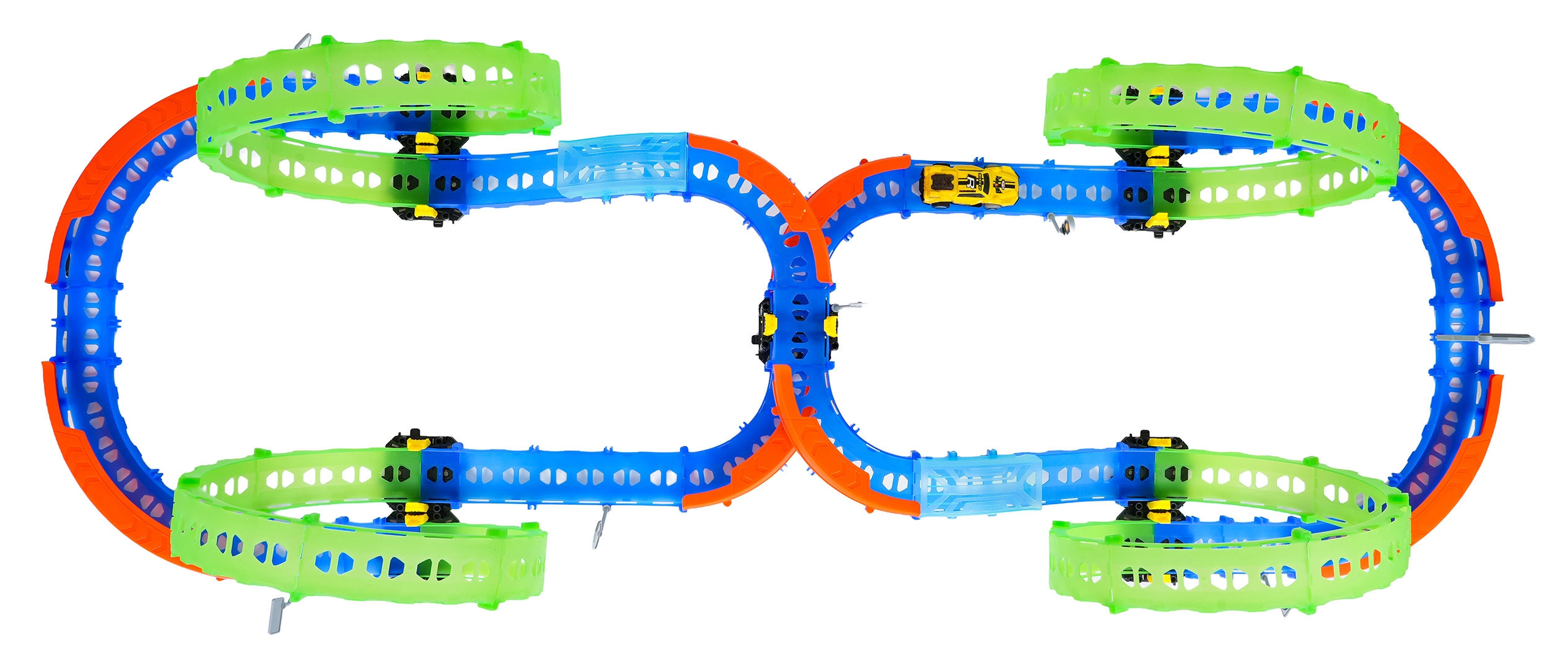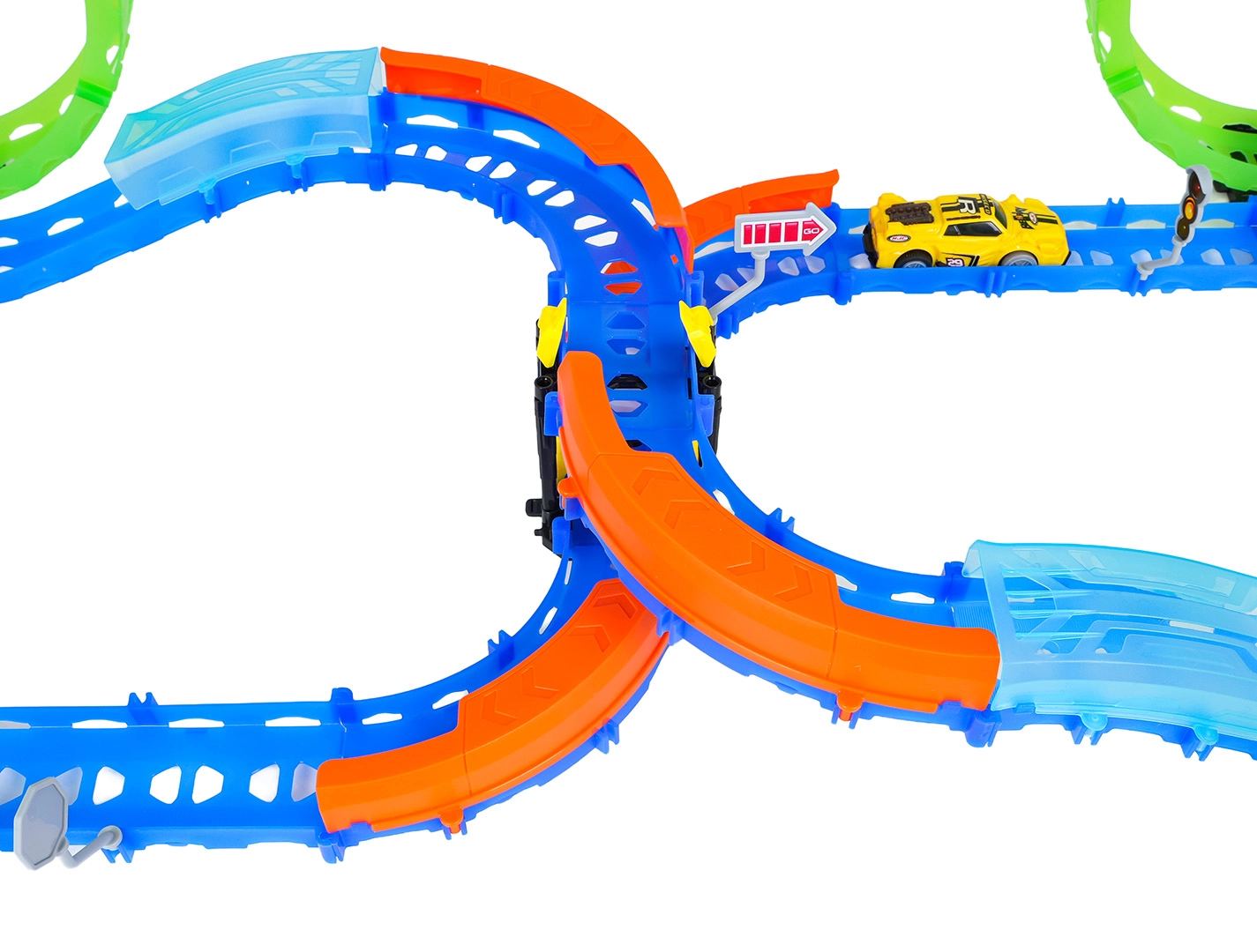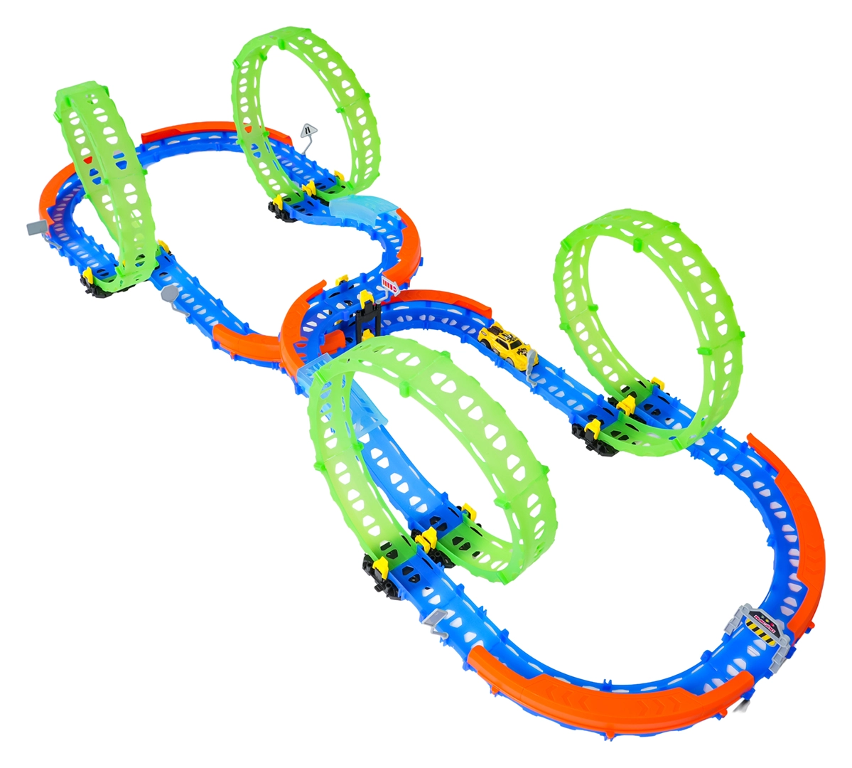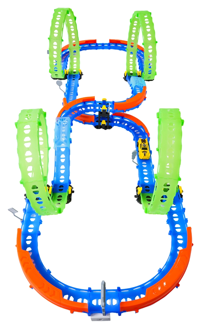 Questa pista colorata offre corse acrobatiche spettacolari e costruzioni creative. Grazie ai loop fluorescenti e al gioco di luci della macchinina dà il meglio al buio, trasformandosi in un tracciato luminoso ricco di emozioni. Le robuste barriere nelle curve aiutano a mantenere la macchinina in traiettoria in sicurezza.