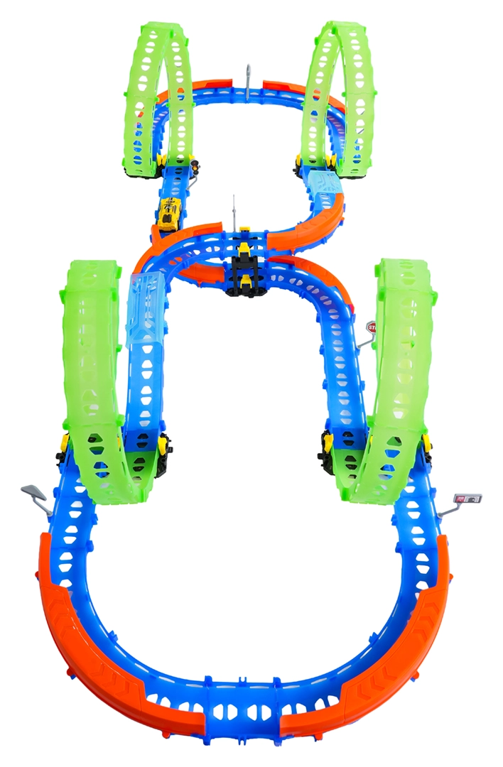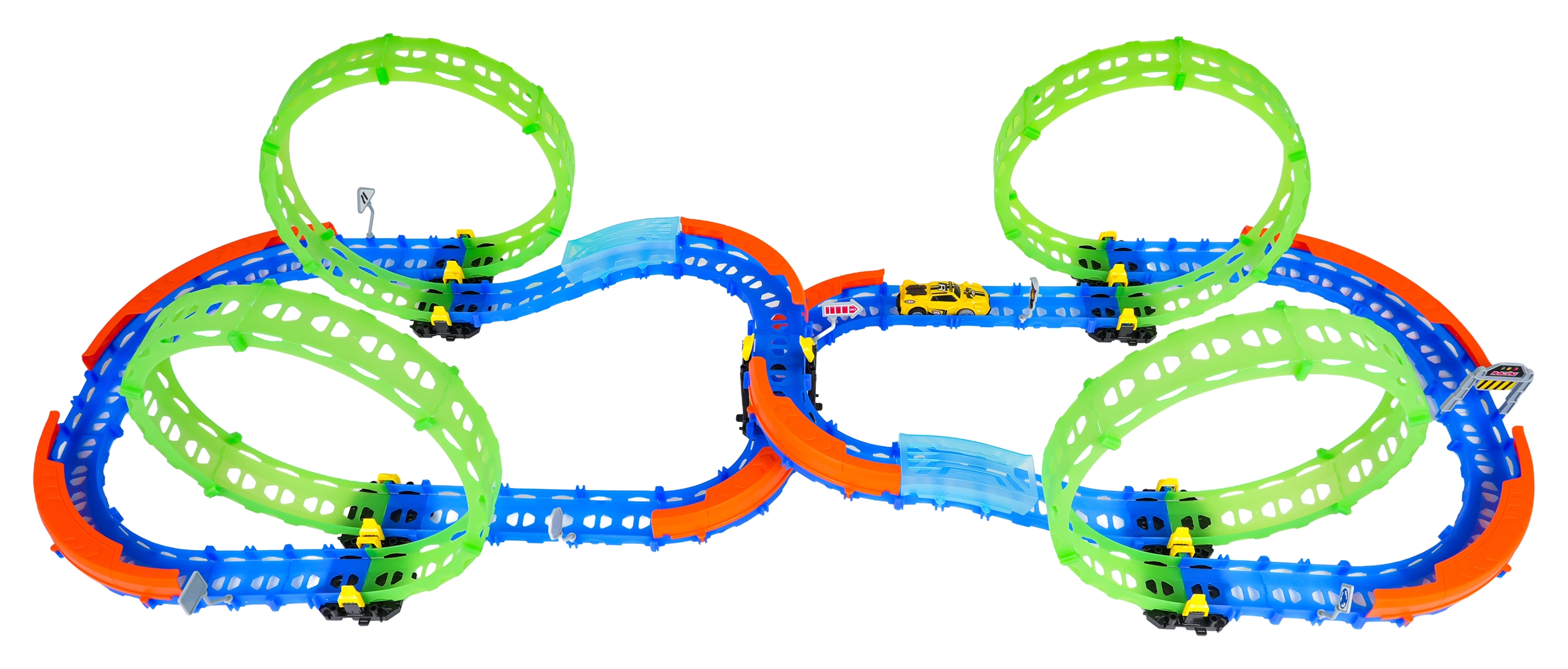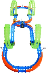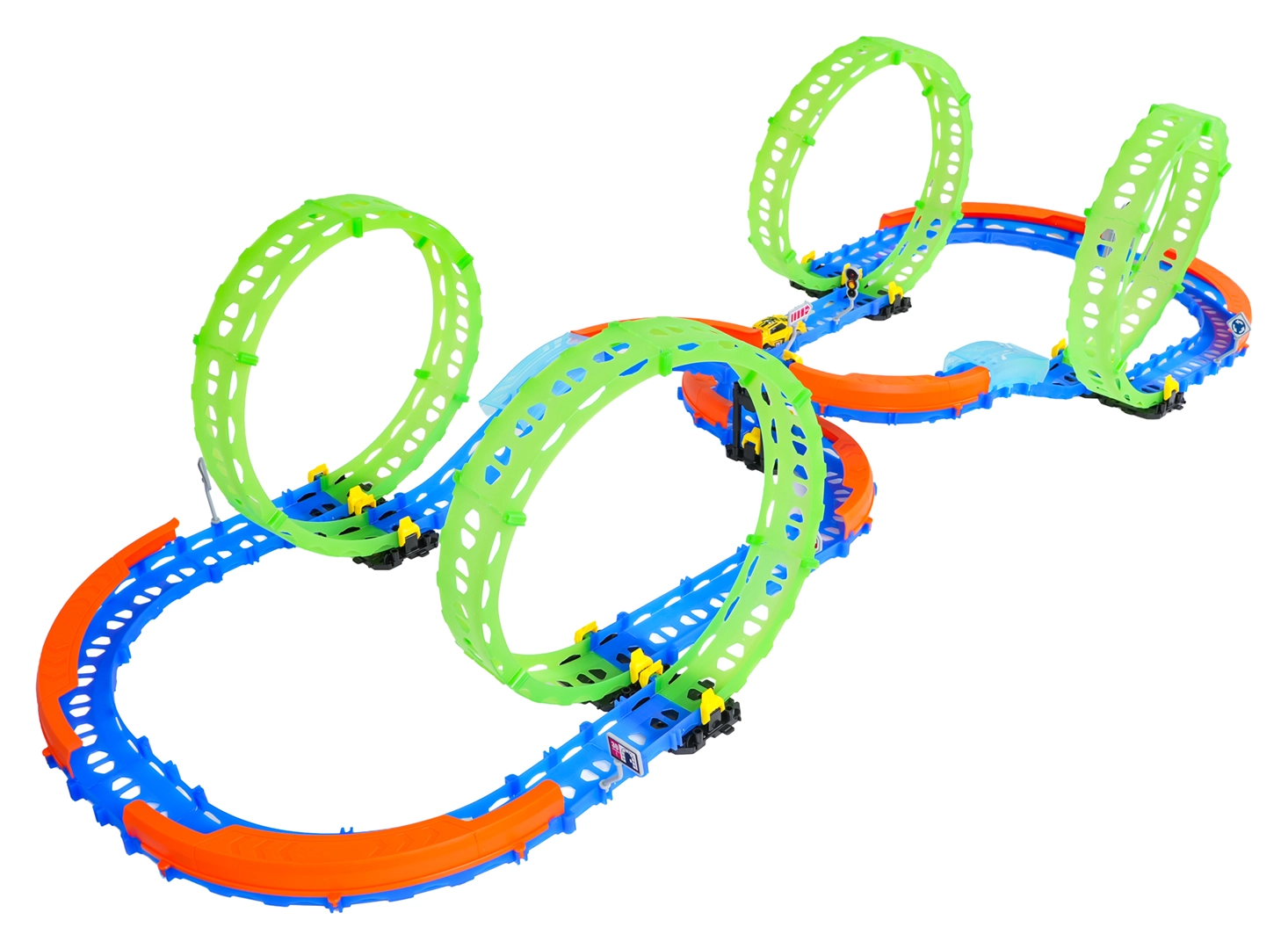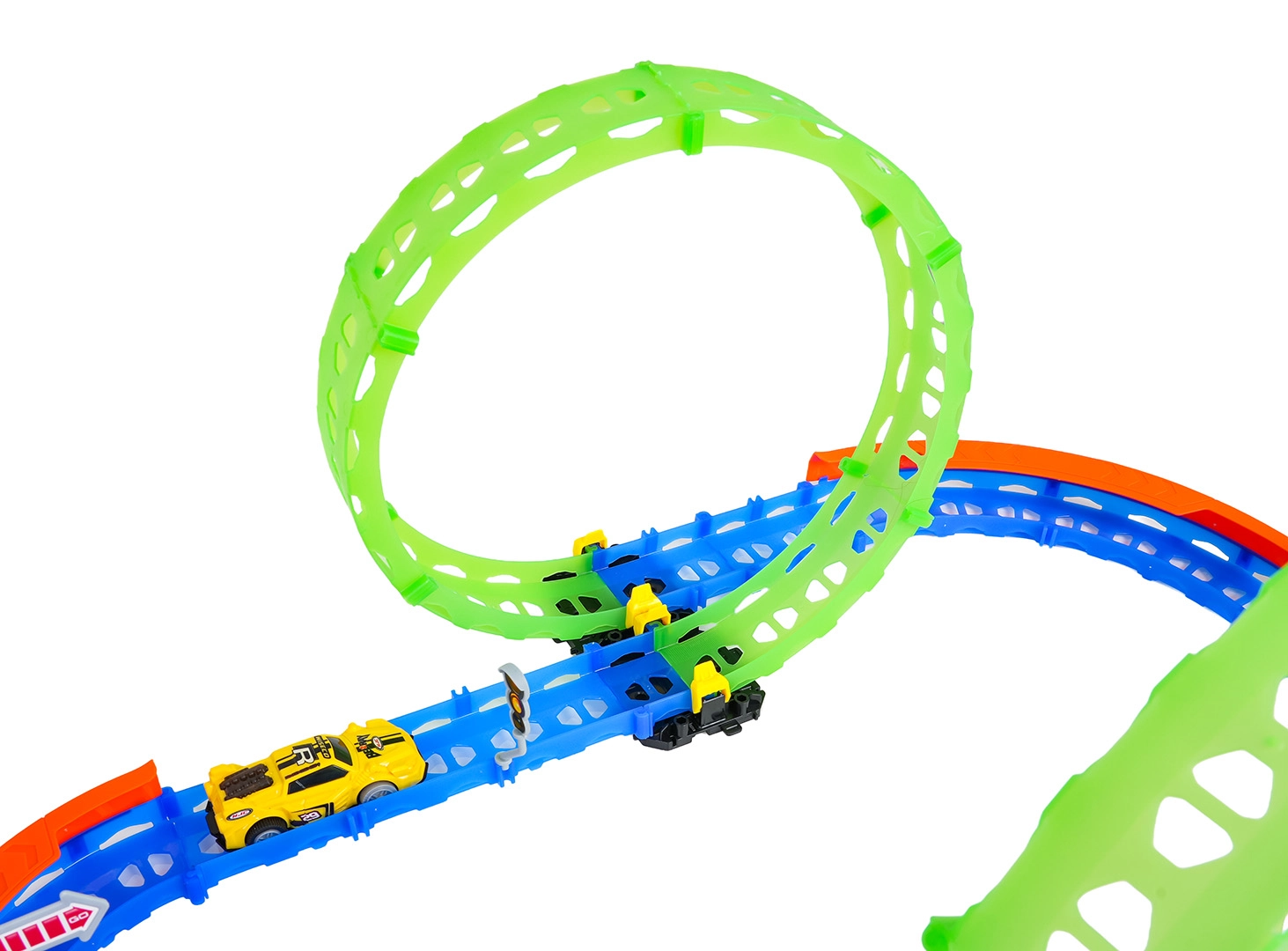 Questa pista colorata offre corse acrobatiche spettacolari e costruzioni creative. Grazie ai loop fluorescenti e al gioco di luci della macchinina dà il meglio al buio, trasformandosi in un tracciato luminoso ricco di emozioni. Le robuste barriere nelle curve aiutano a mantenere la macchinina in traiettoria in sicurezza.