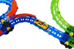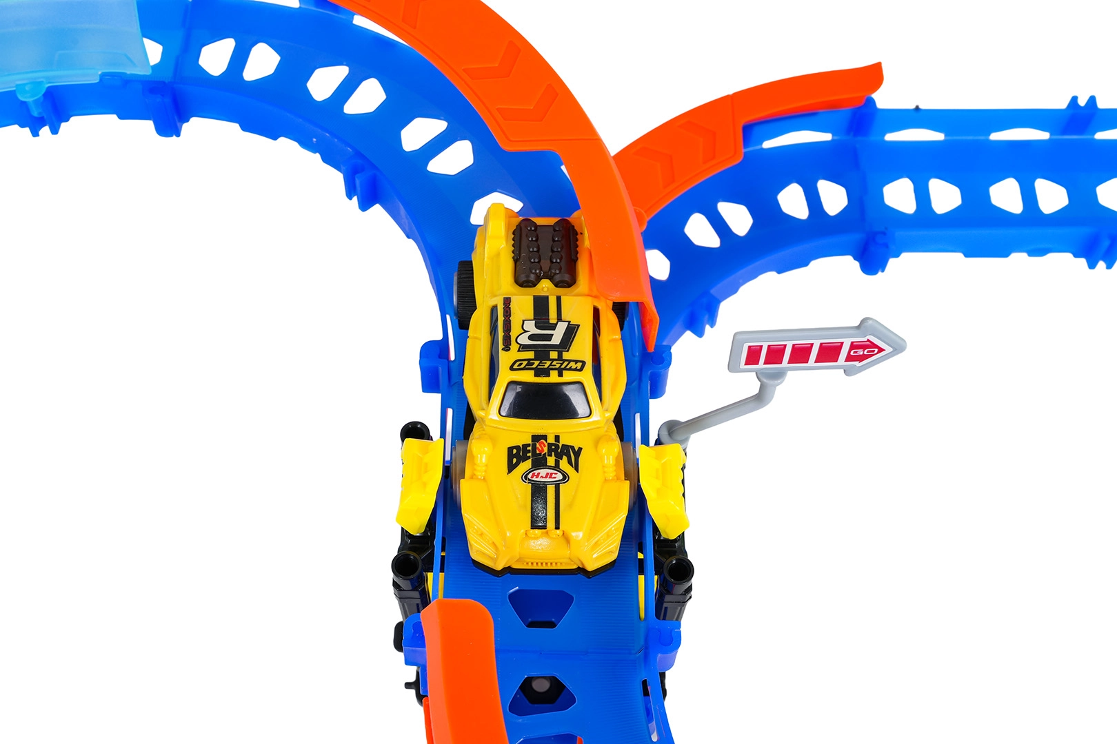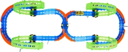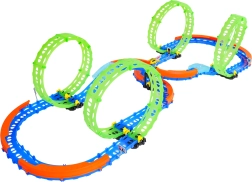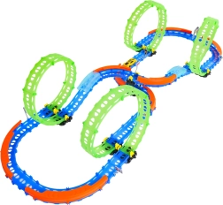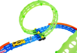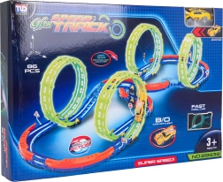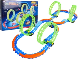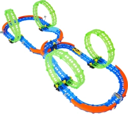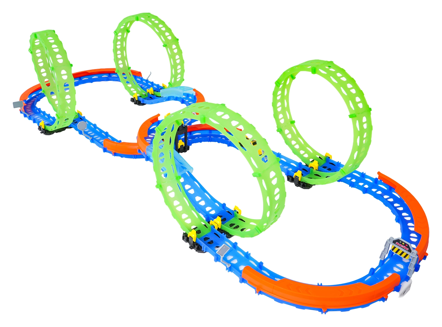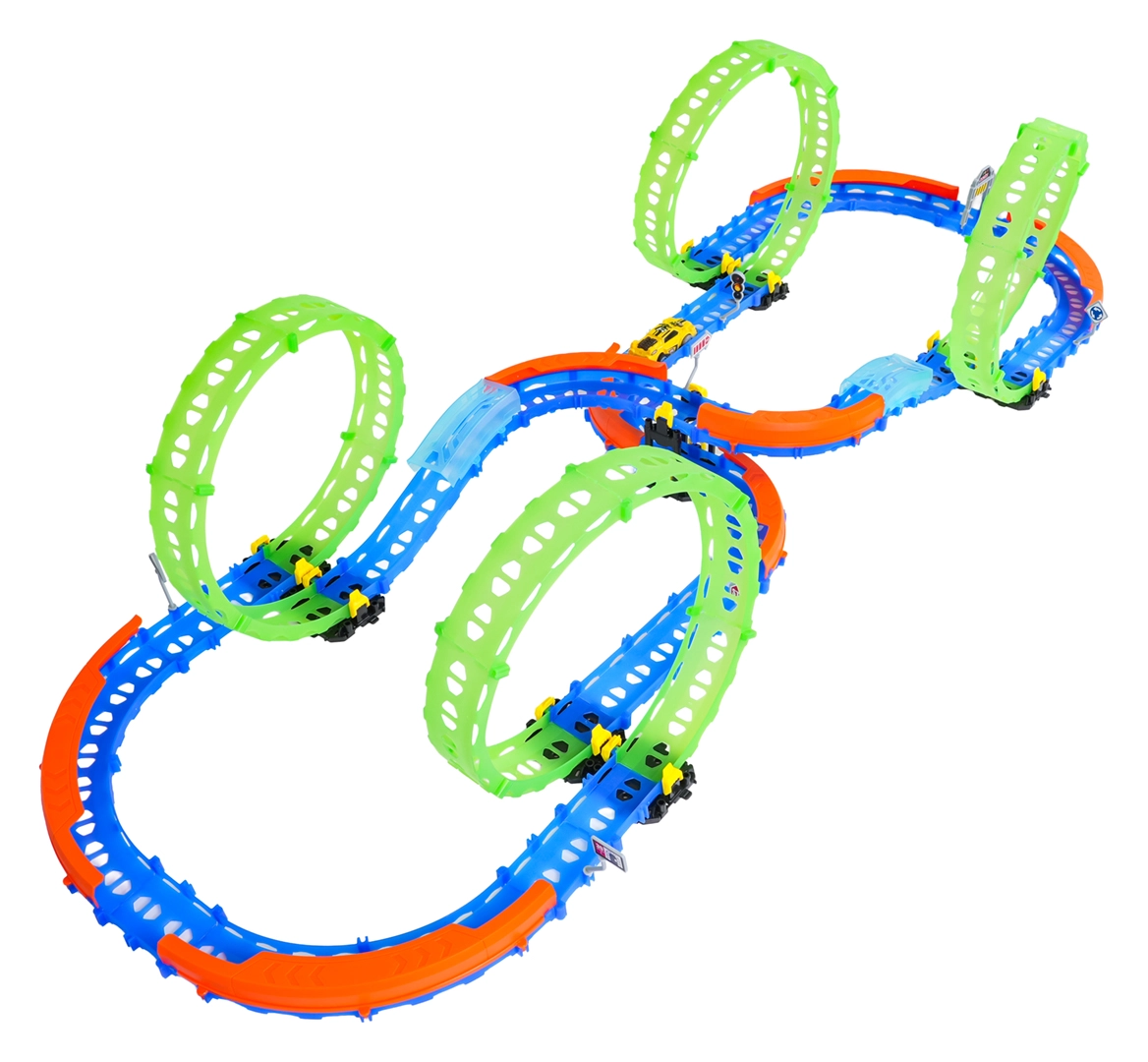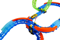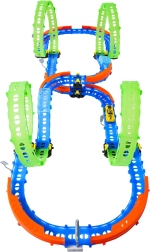 Questa pista colorata offre corse acrobatiche spettacolari e costruzioni creative. Grazie ai loop fluorescenti e al gioco di luci della macchinina dà il meglio al buio, trasformandosi in un tracciato luminoso ricco di emozioni. Le robuste barriere nelle curve aiutano a mantenere la macchinina in traiettoria in sicurezza.