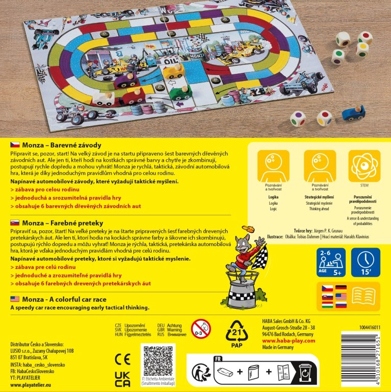 Il divertente gioco di famiglia Monza del marchio Haba offre gare veloci piene di tattica e fortuna. Grazie alle regole semplici è ideale per bambini e adulti, si gioca in 2–6 giocatori e una partita dura solo circa 15 minuti.