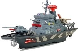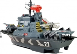 Nave militare con luci e suoni, 2 figurine di soldati, aereo, pontone, set di armi