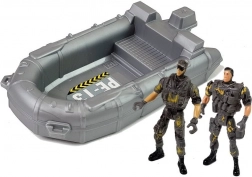 Nella confezione trovi 2 figurine di soldati, un aereo di bordo, un gommone/pontone e un set di armi per un gioco tattico vario.