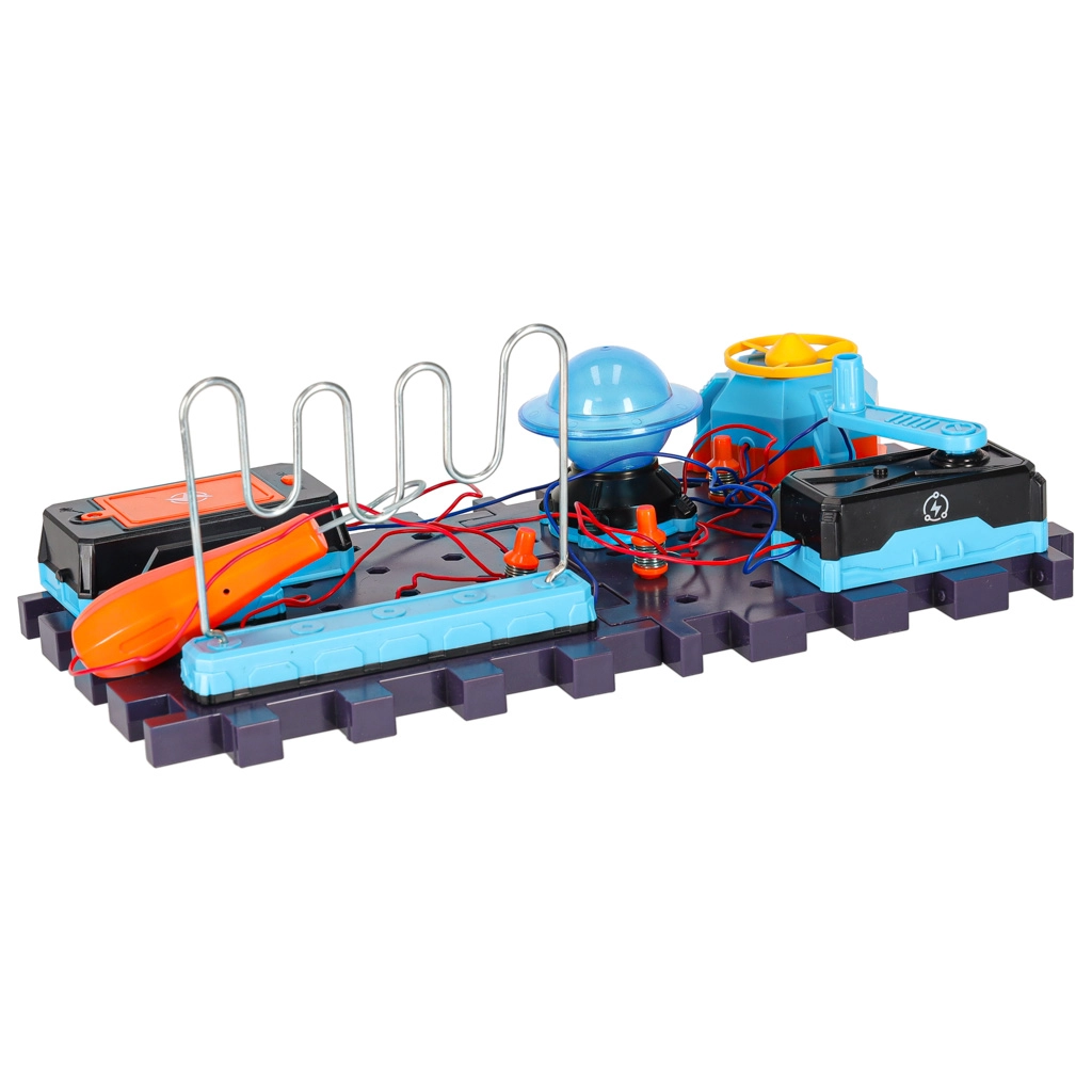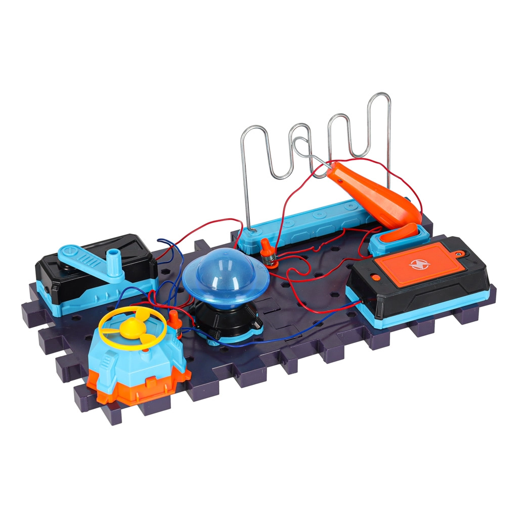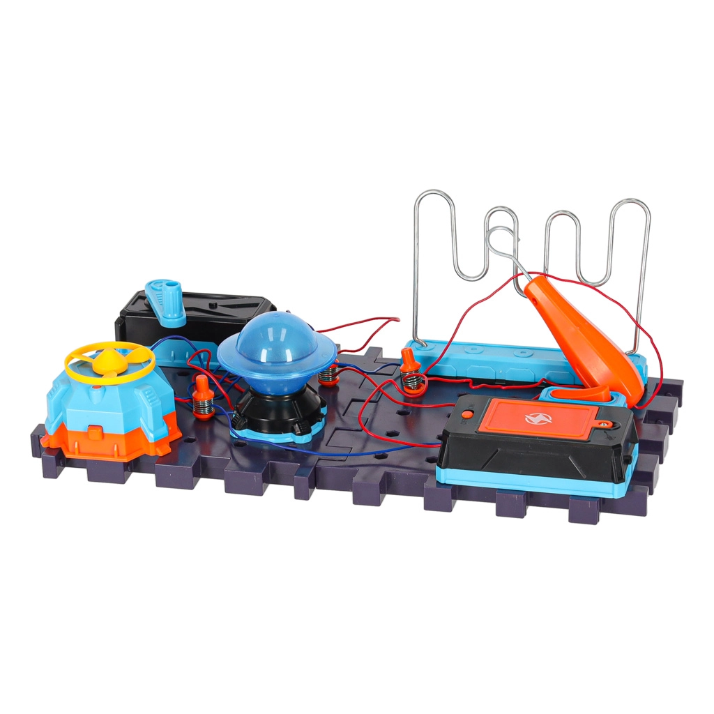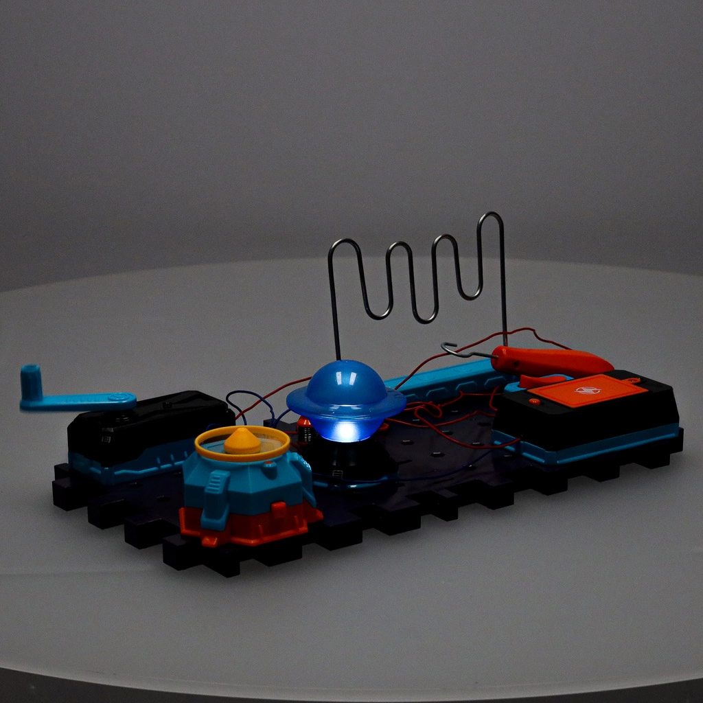 - 2× base di montaggio, 1× modulo batterie, 1× generatore manuale, 1× interruttore, 1× ventola + 2 pale, 1× modulo luminoso “pianeta”, 1× labirinto di filo, 1× impugnatura con sonda e filo, 4× connettore, 3× organizer per cavi, 1× manuale