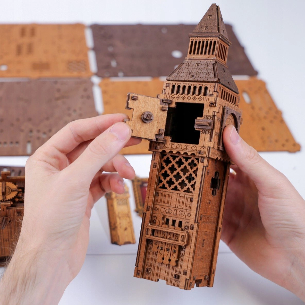 Mettete in gioco logica, precisione e pazienza: la forza qui non serve. Ogni pezzo combacia perfettamente e svela le soluzioni nascoste del puzzle meccanico. Il modello unisce il fascino della torre con orologio di Londra a un eccezionale meccanismo “escape” per un’esperienza unica di montaggio e scoperta.