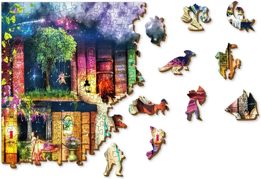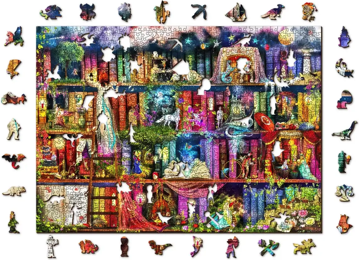 Immergetevi nel mondo della fantasia con il puzzle in legno WOODEN CITY – Biblioteca dei tesori. Colori vivaci, illustrazione originale e lavorazione accurata garantiscono un montaggio piacevole e un bellissimo risultato finale di circa 51,9 × 37,5 cm. Grazie alle forme eccezionali dei pezzi, ogni composizione è una sfida divertente.