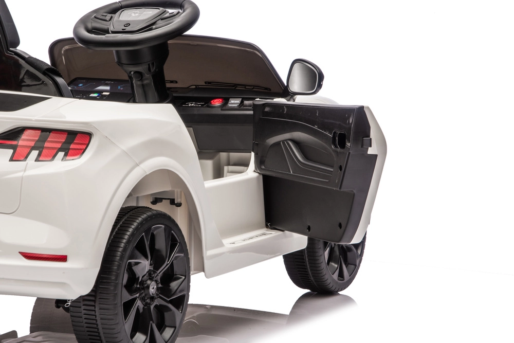 Elegante auto elettrica per bambini FORD MUSTANG MACH‑E 24V in colore bianco offre un aspetto realistico, seduta confortevole e guida sicura. Potente trazione 24V, porte apribili, luci LED e ruote sportive piaceranno ai piccoli piloti e ai genitori in cerca di qualità e divertimento.