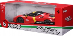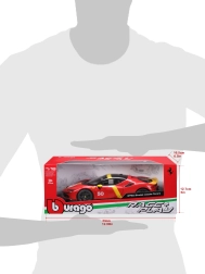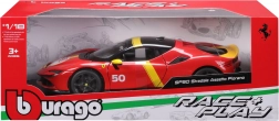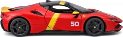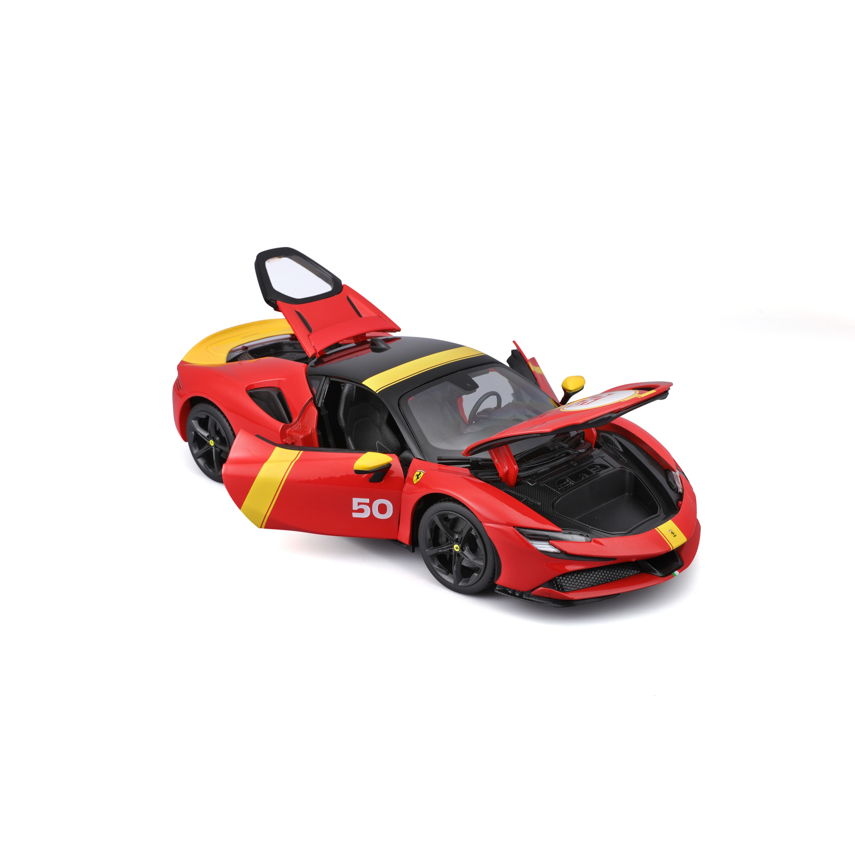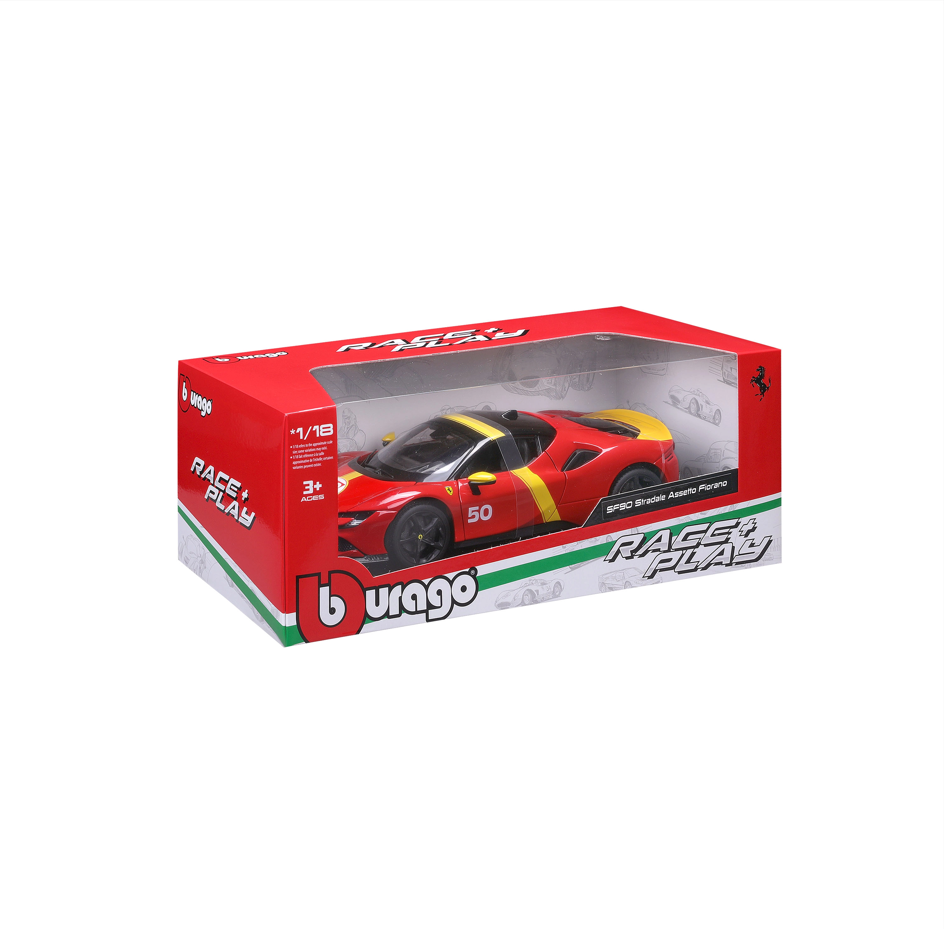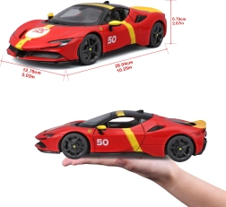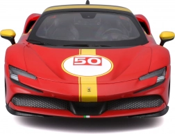 Modello da collezione della Ferrari SF90 Stradale in edizione Assetto Fiorano di Bburago in scala 1:18, apprezzato per i dettagli realistici, le parti apribili funzionali e l'alta qualità costruttiva. Ammira l'interno preciso, la carrozzeria dettagliata con livrea da gara numero 50 e le ruote mobili per un movimento fluido.