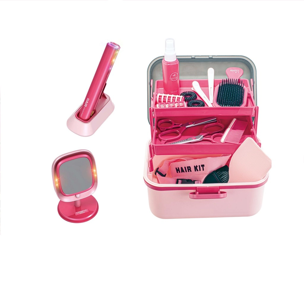 - Piastra per capelli per bambini, base di ricarica, specchio da tavolo con effetti luminosi, valigetta con scomparti, pettini, spazzole, forbici, mollette, spray (giocattolo)